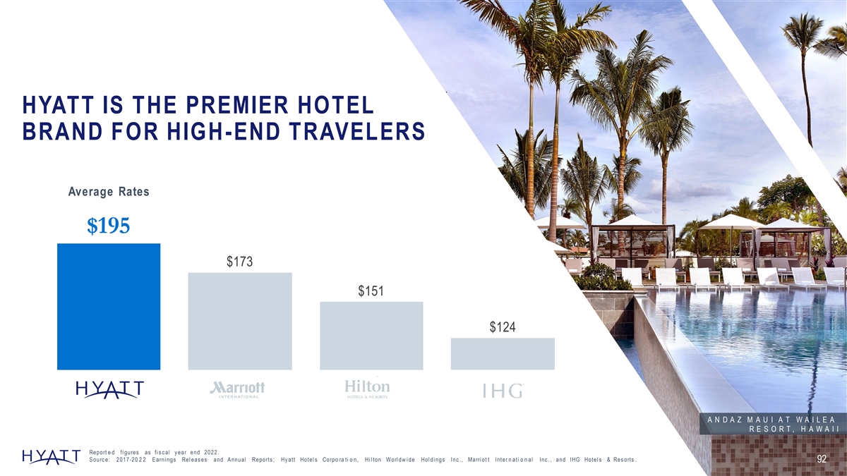 HYATT IS THE PREMIER HOTEL BRAND FOR HIGH-END TRAVELERS Average Rates $195 $173 $151 $124 A N D A Z M A U I A T W A I L E A R E S O R T , H A W A I I Report e d fi gures as fi s c al y ear end 2022. S ourc e: 2017-20 2 2 E arni ngs Rel eas es and A nnual Reports ; Hy att Hotel s Corpo ra ti o n, Hi l ton Worl dw i de Hol di ngs Inc ., Marri ot t Inter n ati o n al Inc ., and IHG Hotel s & Res orts . 92