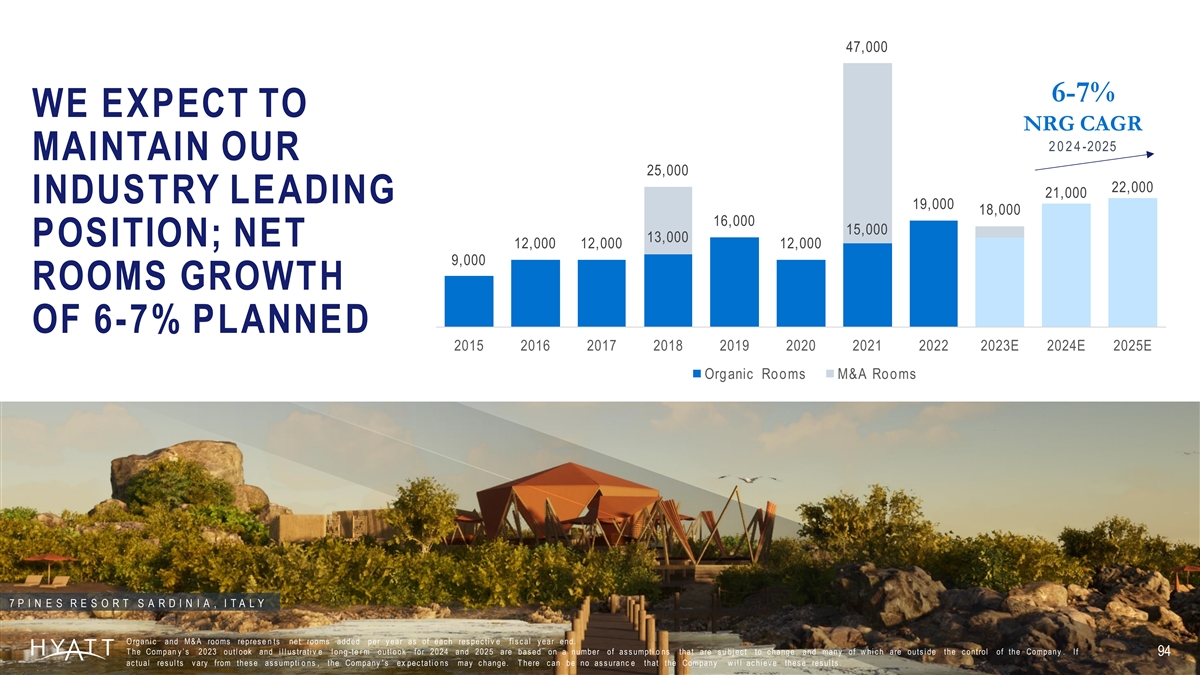 47,000 6-7% WE EXPECT TO NRG CAGR 2024 -2025 MAINTAIN OUR 25,000 22,000 21,000 INDUSTRY LEADING 19,000 18,000 16,000 15,000 13,000 POSITION; NET 12,000 12,000 12,000 9,000 ROOMS GROWTH OF 6-7% PLANNED 2015 2016 2017 2018 2019 2020 2021 2022 2023E 2024E 2025E Organic Rooms M&A Rooms 7 P I N E S R E S O R T S A R D I N I A , I T A L Y O rgani c and M& A rooms repres e n ts net rooms added per y ear as of eac h res pec ti v e fi s c al y ear end. T he Compan y ’ s 2023 outl ook and i l l us trati v e l ong -te r m outl ook for 2024 and 2025 are bas ed on a number of as s umpti o ns that are s u bj ec t to c hange and many of w hi c h are outs i de the c ontrol of the Company . If 94 ac tual res ul ts v ary from thes e as s umpti o ns , the Company ' s ex pec tati o ns may c hange. T here c an be no as s uranc e that the Company wi l l ac hi ev e thes e res ul ts . .