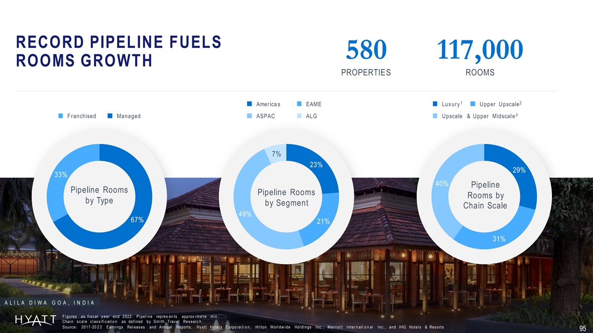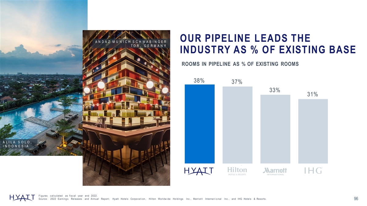 RECORD PIPELINE FUELS 580 117,000 ROOMS GROWTH PROPERTIES ROOMS 1 2 America s EAME Lux ury Upper Upscale 3 Franchised Managed ASPAC ALG Upscale & Upper Midscal e 7% 23% 29% 33% 40% Pipeline Pipeline Rooms Pipeline Rooms Rooms by by Type by Segment Chain Scale 49% 67% 21% 31% A L I L A D I W A G O A , I N D I A F i gures as fi s c al y ear end 2022. P i pel i ne repres en ts approx i ma t e mi x . Chai n s c al e c l as s i fi c ati o n as defi ned by S mi th T rav el Res earc h . 95 S ourc e: 2017 -20 2 2 E arni ngs Rel eas es and A nnual Reports ; Hy att Hotel s Corpo ra ti o n, Hi l ton Worl dw i de Hol di ngs Inc ., Marri ot t Inter n ati o n al Inc ., and IHG Hotel s & Res orts . 95