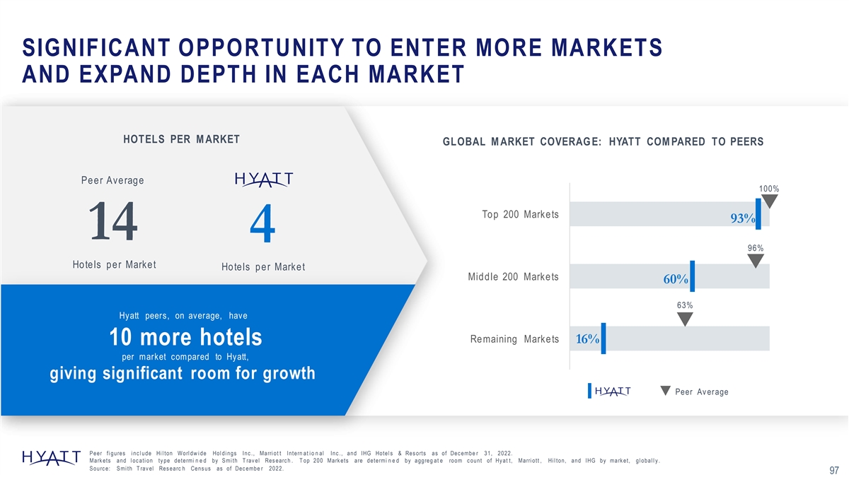 SIGNIFICANT OPPORTUNITY TO ENTER MORE MARKETS AND EXPAND DEPTH IN EACH MARKET HOTELS PER M ARKET GLOBAL M ARKET COVERAG E: HYATT COM PARED TO PEERS Peer Average 100% Top 200 Markets 93% 14 4 96% Hotels per Market Hotels per Market Middle 200 Markets 60% 63% Hyatt peers, on average, have Remaining Markets 16% 10 more hotels per market compared to Hyatt, giving significant room for growth Peer Av erage P eer fi gures i nc l ude Hi l ton Worl dw i de Hol di ngs Inc ., Marri ot t Intern at i o n al Inc ., and IHG Hotel s & Res orts as of Dec embe r 31, 2022. Mark ets and l oc ati on ty pe determi n e d by S mi th T rav el Res earc h . T op 200 Mark ets are determi n e d by aggreg at e room c ount of Hy at t, Marri ott , Hi l ton, and IHG by mark et, gl obal l y . 97 S ourc e: S mi th T rav el Res earc h Cens us as of Dec embe r 2022. 97