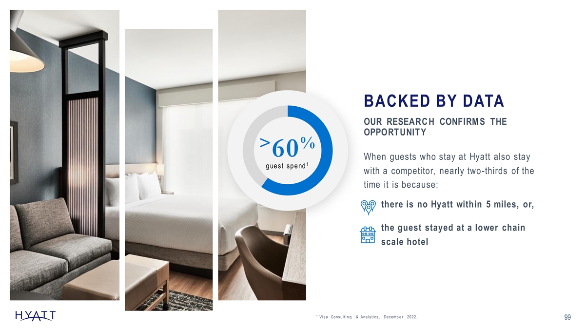 BACKED BY DATA OUR RESEARC H CONFIRM S THE OPPORT UNIT Y > % 60 When guests who stay at Hyatt also stay 1 guest spend with a competitor, nearly two-thirds of the time it is because: there is no Hyatt within 5 miles, or, the guest stayed at a lower chain scale hotel 1 V i s a Cons ul ti n g & A nal y ti c s , Dec emb e r 2022. 99
