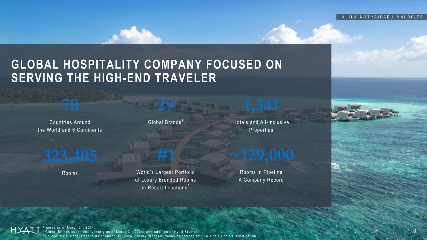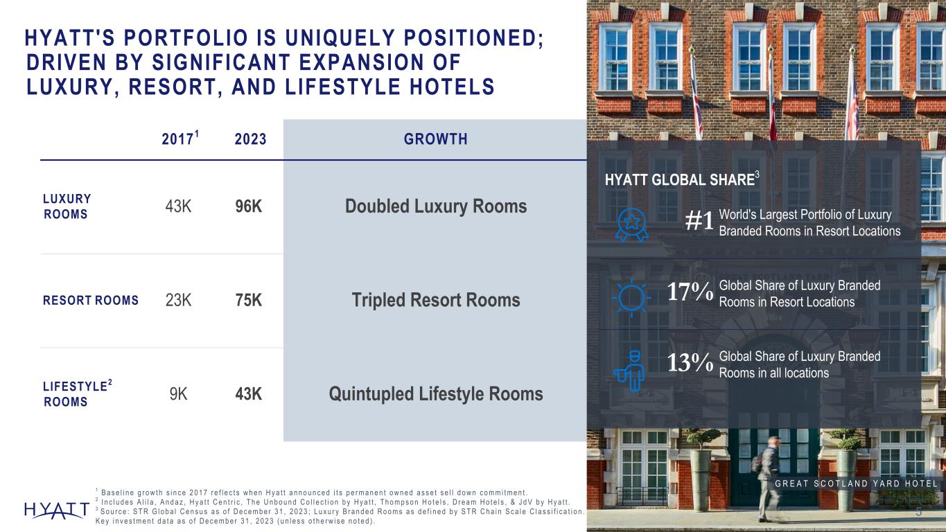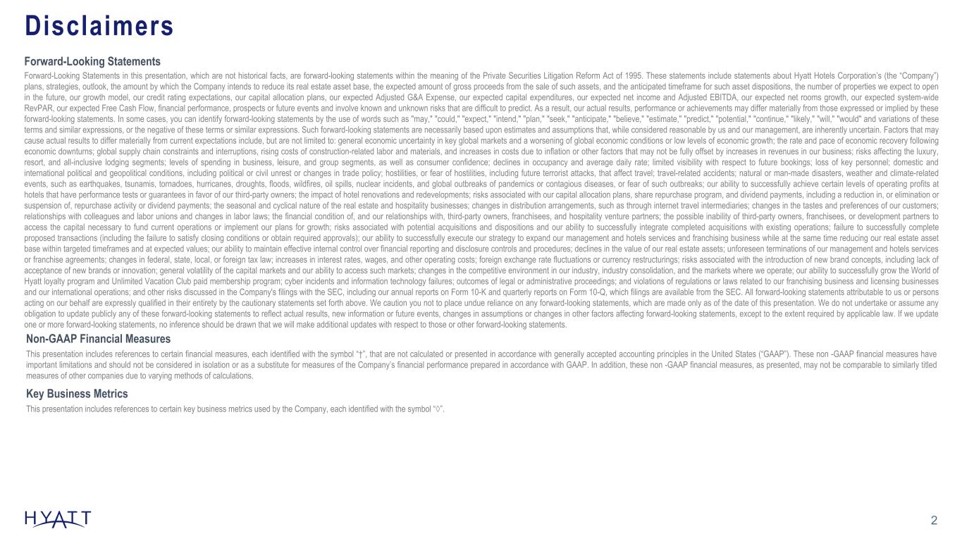 Disclaimers 2 Forward-Looking Statements in this presentation, which are not historical facts, are forward-looking statements within the meaning of the Private Securities Litigation Reform Act of 1995. These statements include statements about Hyatt Hotels Corporation’s (the “Company”) plans, strategies, outlook, the amount by which the Company intends to reduce its real estate asset base, the expected amount of gross proceeds from the sale of such assets, and the anticipated timeframe for such asset dispositions, the number of properties we expect to open in the future, our growth model, our credit rating expectations, our capital allocation plans, our expected Adjusted G&A Expense, our expected capital expenditures, our expected net income and Adjusted EBITDA, our expected net rooms growth, our expected system-wide RevPAR, our expected Free Cash Flow, financial performance, prospects or future events and involve known and unknown risks that are difficult to predict. As a result, our actual results, performance or achievements may differ materially from those expressed or implied by these forward-looking statements. In some cases, you can identify forward-looking statements by the use of words such as "may," "could," "expect," "intend," "plan," "seek," "anticipate," "believe," "estimate," "predict," "potential," "continue," "likely," "will," "would" and variations of these terms and similar expressions, or the negative of these terms or similar expressions. Such forward-looking statements are necessarily based upon estimates and assumptions that, while considered reasonable by us and our management, are inherently uncertain. Factors that may cause actual results to differ materially from current expectations include, but are not limited to: general economic uncertainty in key global markets and a worsening of global economic conditions or low levels of economic growth; the rate and pace of economic recovery following economic downturns; global supply chain constraints and interruptions, rising costs of construction-related labor and materials, and increases in costs due to inflation or other factors that may not be fully offset by increases in revenues in our business; risks affecting the luxury, resort, and all-inclusive lodging segments; levels of spending in business, leisure, and group segments, as well as consumer confidence; declines in occupancy and average daily rate; limited visibility with respect to future bookings; loss of key personnel; domestic and international political and geopolitical conditions, including political or civil unrest or changes in trade policy; hostilities, or fear of hostilities, including future terrorist attacks, that affect travel; travel-related accidents; natural or man-made disasters, weather and climate-related events, such as earthquakes, tsunamis, tornadoes, hurricanes, droughts, floods, wildfires, oil spills, nuclear incidents, and global outbreaks of pandemics or contagious diseases, or fear of such outbreaks; our ability to successfully achieve certain levels of operating profits at hotels that have performance tests or guarantees in favor of our third-party owners; the impact of hotel renovations and redevelopments; risks associated with our capital allocation plans, share repurchase program, and dividend payments, including a reduction in, or elimination or suspension of, repurchase activity or dividend payments; the seasonal and cyclical nature of the real estate and hospitality businesses; changes in distribution arrangements, such as through internet travel intermediaries; changes in the tastes and preferences of our customers; relationships with colleagues and labor unions and changes in labor laws; the financial condition of, and our relationships with, third-party owners, franchisees, and hospitality venture partners; the possible inability of third-party owners, franchisees, or development partners to access the capital necessary to fund current operations or implement our plans for growth; risks associated with potential acquisitions and dispositions and our ability to successfully integrate completed acquisitions with existing operations; failure to successfully complete proposed transactions (including the failure to satisfy closing conditions or obtain required approvals); our ability to successfully execute our strategy to expand our management and hotels services and franchising business while at the same time reducing our real estate asset base within targeted timeframes and at expected values; our ability to maintain effective internal control over financial reporting and disclosure controls and procedures; declines in the value of our real estate assets; unforeseen terminations of our management and hotels services or franchise agreements; changes in federal, state, local, or foreign tax law; increases in interest rates, wages, and other operating costs; foreign exchange rate fluctuations or currency restructurings; risks associated with the introduction of new brand concepts, including lack of acceptance of new brands or innovation; general volatility of the capital markets and our ability to access such markets; changes in the competitive environment in our industry, industry consolidation, and the markets where we operate; our ability to successfully grow the World of Hyatt loyalty program and Unlimited Vacation Club paid membership program; cyber incidents and information technology failures; outcomes of legal or administrative proceedings; and violations of regulations or laws related to our franchising business and licensing businesses and our international operations; and other risks discussed in the Company's filings with the SEC, including our annual reports on Form 10-K and quarterly reports on Form 10-Q, which filings are available from the SEC. All forward-looking statements attributable to us or persons acting on our behalf are expressly qualified in their entirety by the cautionary statements set forth a