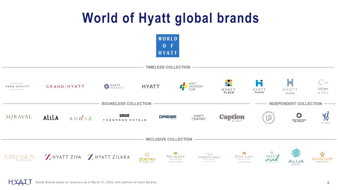 World of Hyatt global brands G l o b a l B r a n d s b a s e d o n I n v e n t o r y a s o f M a r c h 3 1 , 2 0 2 4 , w i t h a d d i t i o n o f H y a t t S t u d i o s . 4