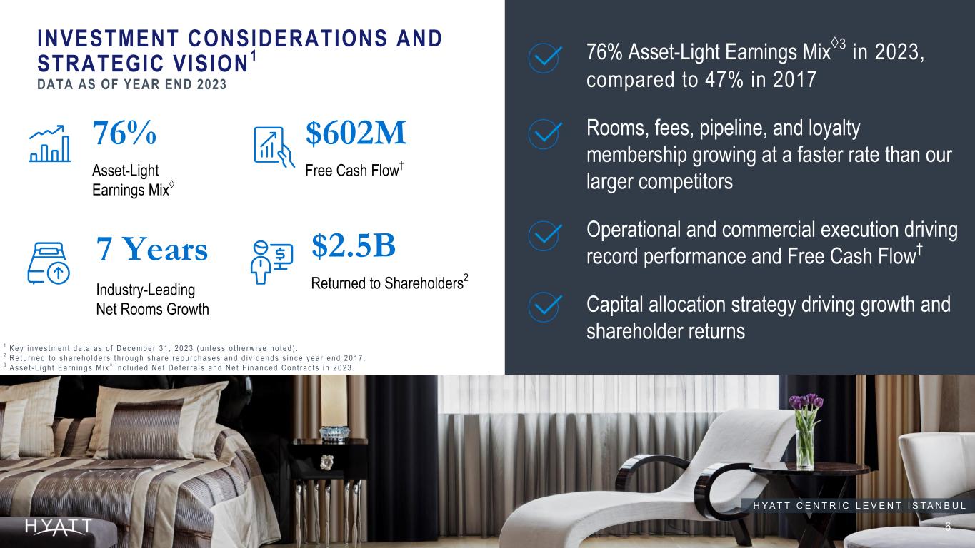 20171 2023 GROWTH LUXURY ROOMS 43K 96K Doubled Luxury Rooms RESORT ROOMS 23K 75K Tripled Resort Rooms LIFESTYLE2 ROOMS 9K 43K Quintupled Lifestyle Rooms HYATT'S PORTFOLIO IS UNIQUELY POSITIONED; DRIVEN BY SIGNIFICANT EXPANSION OF LUXURY, RESORT, AND LIFESTYLE HOTELS  5 HYATT GLOBAL SHARE3 #1 World's Largest Portfolio of Luxury Branded Rooms in Resort Locations 17% Global Share of Luxury Branded Rooms in Resort Locations 13% Global Share of Luxury Branded Rooms in all locations G R E A T S C O T L A N D Y A R D H O T E L 1 B a s e l i n e g r o w t h s i n c e 2 0 1 7 r e f l e c t s w h e n H y a t t a n n o u n c e d i t s p e r m a n e n t o w n e d a s s e t s e l l d o w n c o m m i t m e n t . 2 I n c l u d e s A l i l a , A n d a z , H y a t t C e n t r i c , T h e U n b o u n d C o l l e c t i o n b y H y a t t , T h o m p s o n H o t e l s , D r e a m H o t e l s , & J d V b y H y a t t . 3 S o u r c e : S T R G l o b a l C e n s u s a s o f D e c e m b e r 3 1 , 2 0 2 3 ; L u x u r y B r a n d e d R o o m s a s d e f i n e d b y S T R C h a i n S c a l e C l a s s i f i c a t i o n . K e y i n v e s t m e n t d a t a a s o f D e c e m b e r 3 1 , 2 0 2 3 ( u n l e s s o t h e r w i s e n o t e d ) .