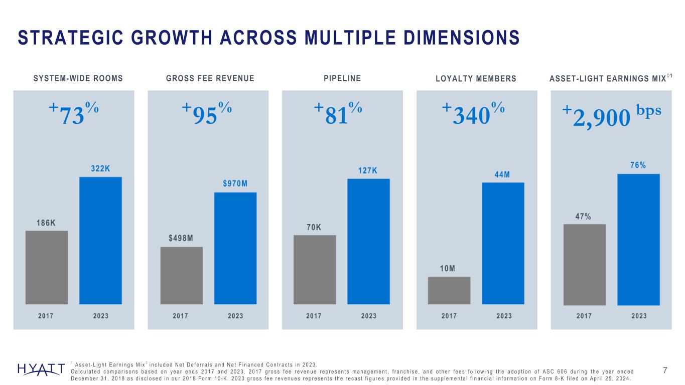 INVESTMENT CONSIDERATIONS AND STRATEGIC VISION 1 6 76% Asset-Light Earnings Mix◊ 7 Years Industry-Leading Net Rooms Growth 76% Asset-Light Earnings Mix◊3 in 2023, compared to 47% in 2017 Rooms, fees, pipeline, and loyalty membership growing at a faster rate than our larger competitors Operational and commercial execution driving record performance and Free Cash Flow† Capital allocation strategy driving growth and shareholder returns $2.5B Returned to Shareholders2 H Y A T T C E N T R I C L E V E N T I S T A N B U L $602M Free Cash Flow† 1 K e y i n v e s t m e n t d a t a a s o f D e c e m b e r 3 1 , 2 0 2 3 ( u n l e s s o t h e r w i s e n o t e d ) . 2 R e t u r n e d t o s h a r e h o l d e r s t h r o u g h s h a r e r e p u r c h a s e s a n d d i v i d e n d s s i n c e y e a r e n d 2 0 1 7 . 3 A s s e t - L i g h t E a r n i n g s M i x ◊ i n c l u d e d N e t D e f e r r a l s a n d N e t F i n a n c e d C o n t r a c t s i n 2 0 2 3 . DATA AS OF YEAR END 2023