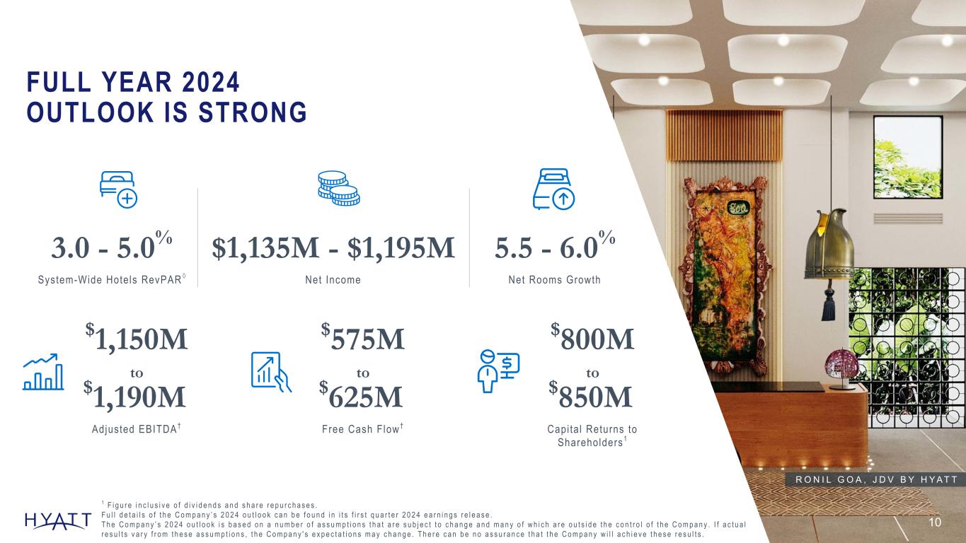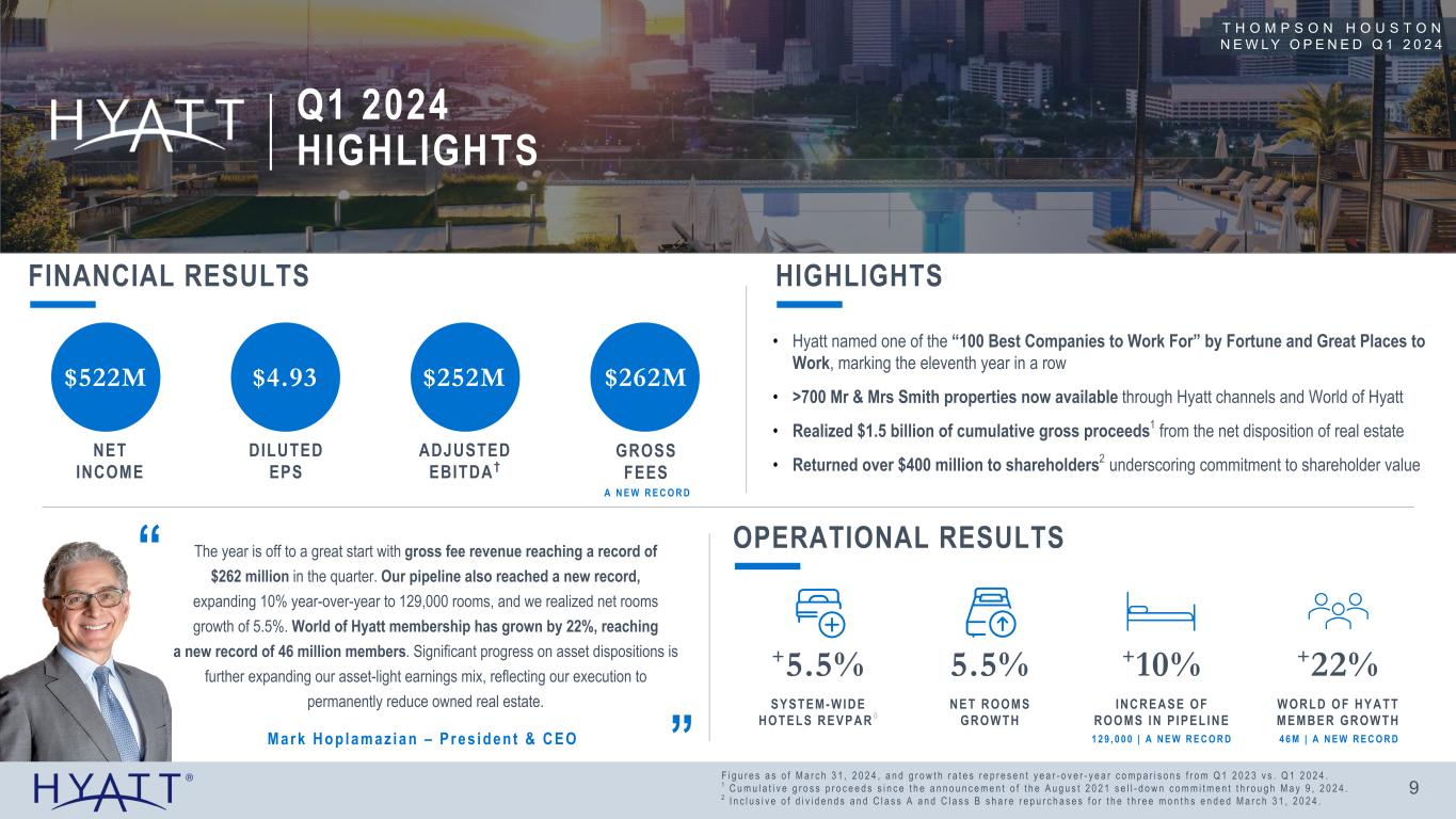 9 Q1 2024 HIGHLIGHTS M a r k H o p l a m a z i a n – P r e s i d e n t & C E O The year is off to a great start with gross fee revenue reaching a record of $262 million in the quarter. Our pipeline also reached a new record, expanding 10% year-over-year to 129,000 rooms, and we realized net rooms growth of 5.5%. World of Hyatt membership has grown by 22%, reaching a new record of 46 million members. Significant progress on asset dispositions is further expanding our asset-light earnings mix, reflecting our execution to permanently reduce owned real estate. ADJUSTED EBITDA† DILUTED EPS GROSS FEES $522M NET INCOME $58 M $4.93 $252M $262M OPERATIONAL RESULTS • Hyatt named one of the “100 Best Companies to Work For” by Fortune and Great Places to Work, marking the eleventh year in a row • >700 Mr & Mrs Smith properties now available through Hyatt channels and World of Hyatt • Realized $1.5 billion of cumulative gross proceeds1 from the net disposition of real estate • Returned over $400 million to shareholders2 underscoring commitment to shareholder value “ “ F i g u r e s a s o f M a r c h 3 1 , 2 0 2 4 , a n d g r o w t h r a t e s r e p r e s e n t y e a r - o v e r - y e a r c o m p a r i s o n s f r o m Q 1 2 0 2 3 v s . Q 1 2 0 2 4 . 1 C u m u l a t i v e g r o s s p r o c e e d s s i n c e t h e a n n o u n c e m e n t o f t h e A u g u s t 2 0 2 1 s e l l - d o w n c o m m i t m e n t t h r o u g h M a y 9 , 2 0 2 4 . 2 I n c l u s i v e o f d i v i d e n d s a n d C l a s s A a n d C l a s s B s h a r e r e p u r c h a s e s f o r t h e t h r e e m o n t h s e n d e d M a r c h 3 1 , 2 0 2 4 . T H O M P S O N H O U S T O N N E W L Y O P E N E D Q 1 2 0 2 4 FINANCIAL RESULTS HIGHLIGHTS +10% INCREASE OF ROOMS IN P IPEL INE 5.5% NET ROOMS GROWTH +5.5% SYSTEM-WIDE HOTELS REVPAR ◊ +22% WORLD OF HYATT MEMBER GROWTH 1 2 9 , 0 0 0 | A N E W R E C O R D 4 6 M | A N E W R E C O R D A N E W R E C O R D