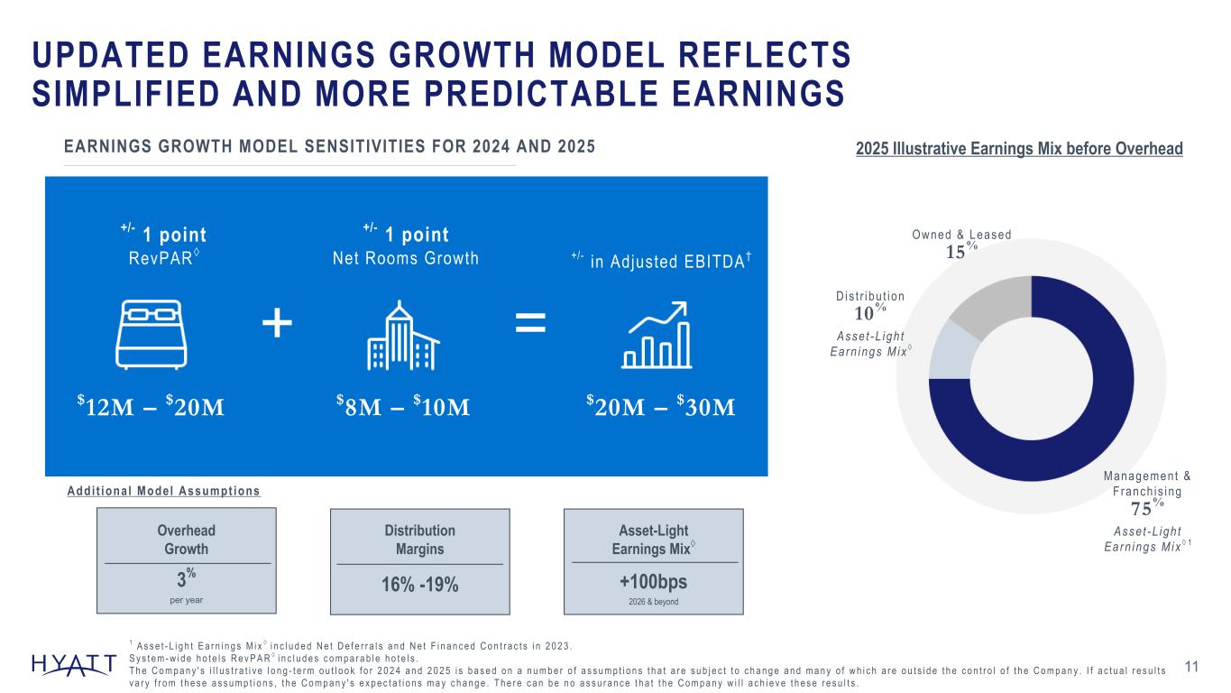 FULL YEAR 2024 OUTLOOK IS STRONG 10 R O N I L G O A , J D V B Y H Y A T T $1,150M to $1,190M  Adjusted EBITDA † $575M to $625M  Free Cash Flow † $800M to $850M  Capi ta l Returns to Shareholders 1 1 F i g u r e i n c l u s i v e o f d i v i d e n d s a n d s h a r e r e p u r c h a s e s . F u l l d e t a i l s o f t h e C o m p a n y ’ s 2 0 2 4 o u t l o o k c a n b e f o u n d i n i t s f i r s t q u a r t e r 2 0 2 4 e a r n i n g s r e l e a s e . T h e C o m p a n y ’ s 2 0 2 4 o u t l o o k i s b a s e d o n a n u m b e r o f a s s u m p t i o n s t h a t a r e s u b j e c t t o c h a n g e a n d m a n y o f w h i c h a r e o u t s i d e t h e c o n t r o l o f t h e C o m p a n y . I f a c t u a l r e s u l t s v a r y f r o m t h e s e a s s u m p t i o n s , t h e C o m p a n y ' s e x p e c t a t i o n s m a y c h a n g e . T h e r e c a n b e n o a s s u r a n c e t h a t t h e C o m p a n y w i l l a c h i e v e t h e s e r e s u l t s . 3.0 - 5.0% System-Wide Hote ls RevPAR ◊ $1,135M - $1,195M Net Income 5.5 - 6.0% Net Rooms Growth