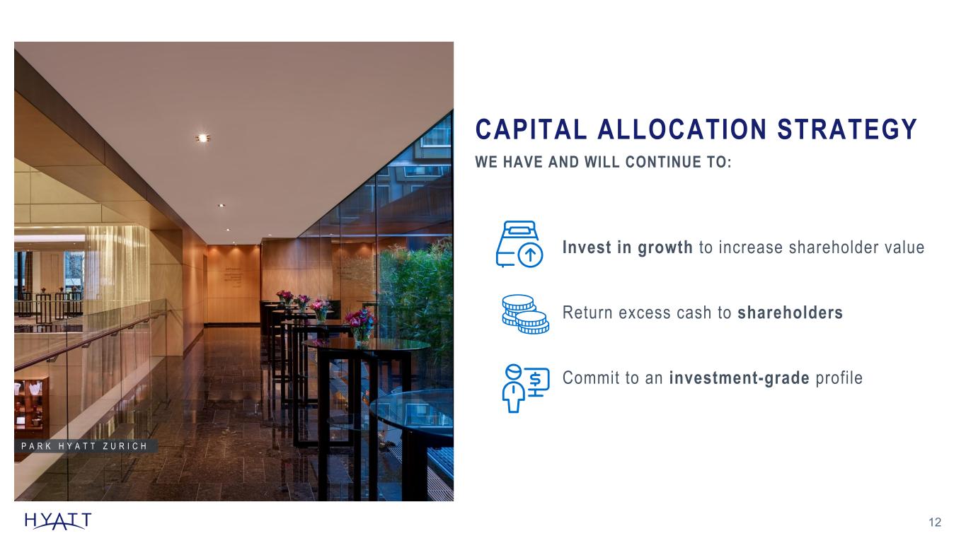 UPDATED EARNINGS GROWTH MODEL REFLECTS SIMPLIFIED AND MORE PREDICTABLE EARNINGS 11 EARNINGS GROWTH MODEL SENSITIVITIES FOR 2024 AND 2025 +/- 1 point RevPAR◊ +/- in Adjusted EBITDA† $20M – $30M + = Addi t iona l Mode l Assumpt ions 2025 Illustrative Earnings Mix before Overhead Asset-Light Earnings Mix◊ +100bps 2026 & beyond Managemen t & F ranch i s i ng 75% Asse t -L igh t Ea rn ings M ix ◊ 1 Dis t r i bu t i on 10% Asse t -L igh t Ea rn ings M ix ◊ Owned & Leased 15% +/- 1 point Net Rooms Growth $12M – $20M $8M – $10M Distribution Margins Overhead Growth 3% per year 2026 & BEYOND: +100bps increase in asset-light earnings per year 1 A s s e t - L i g h t E a r n i n g s M i x ◊ i n c l u d e d N e t D e f e r r a l s a n d N e t F i n a n c e d C o n t r a c t s i n 2 0 2 3 . S y s t e m - w i d e h o t e l s R e v P A R ◊ i n c l u d e s c o m p a r a b l e h o t e l s . T h e C o m p a n y ' s i l l u s t r a t i v e l o n g - t e r m o u t l o o k f o r 2 0 2 4 a n d 2 0 2 5 i s b a s e d o n a n u m b e r o f a s s u m p t i o n s t h a t a r e s u b j e c t t o c h a n g e a n d m a n y o f w h i c h a r e o u t s i d e t h e c o n t r o l o f t h e C o m p a n y . I f a c t u a l r e s u l t s v a r y f r o m t h e s e a s s u m p t i o n s , t h e C o m p a n y ' s e x p e c t a t i o n s m a y c h a n g e . T h e r e c a n b e n o a s s u r a n c e t h a t t h e C o m p a n y w i l l a c h i e v e t h e s e r e s u l t s . 16% -19%