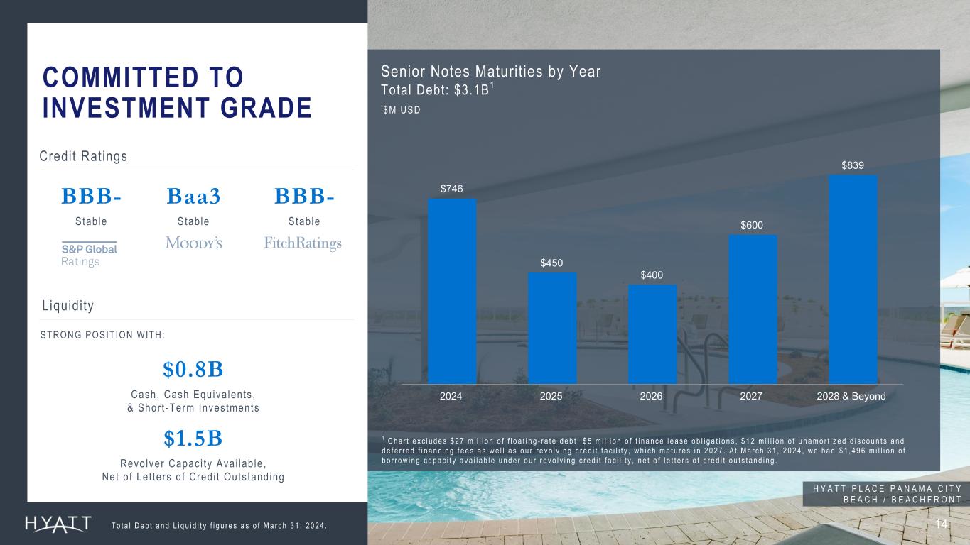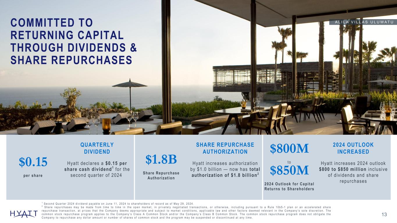 $0.15 per share QUARTERLY DIVIDEND Hyat t dec lares a $0.15 per share cash dividend 1 for the second quar ter o f 2024 $1.8B Share Repurchase Author iza t ion SHARE REPURCHASE AUTHORIZATION Hyat t increases author izat ion by $1.0 b i l l ion — now has total authorizat ion of $1.8 bi l l ion 2 $800M t o $850M 2024 Out look fo r Cap i ta l Re turns to Shareho lders 2024 OUTLOOK INCREASED Hyat t increases 2024 out look $800 to $850 mil l ion inc lus ive of d iv idends and share repurchases COMMITTED TO RETURNING CAPITAL THROUGH DIVIDENDS & SHARE REPURCHASES   13 A L I L A V I L L A S U L U W A T U 1 S e c o n d Q u a r t e r 2 0 2 4 d i v i d e n d p a y a b l e o n J u n e 1 1 , 2 0 2 4 t o s h a r e h o l d e r s o f r e c o r d a s o f M a y 2 9 , 2 0 2 4 . 2 S h a r e r e p u r c h a s e s m a y b e m a d e f r o m t i m e t o t i m e i n t h e o p e n m a r k e t , i n p r i v a t e l y n e g o t i a t e d t r a n s a c t i o n s , o r o t h e r w i s e , i n c l u d i n g p u r s u a n t t o a R u l e 1 0 b 5 - 1 p l a n o r a n a c c e l e r a t e d s h a r e r e p u r c h a s e t r a n s a c t i o n , a t p r i c e s t h a t t h e C o m p a n y d e e m s a p p r o p r i a t e a n d s u b j e c t t o m a r k e t c o n d i t i o n s , a p p l i c a b l e l a w a n d o t h e r f a c t o r s d e e m e d r e l e v a n t i n t h e C o m p a n y ’ s s o l e d i s c r e t i o n . T h e c o m m o n s t o c k r e p u r c h a s e p r o g r a m a p p l i e s t o t h e C o m p a n y ’ s C l a s s A C o m m o n S t o c k a n d / o r t h e C o m p a n y ’ s C l a s s B C o m m o n S t o c k . T h e c o m m o n s t o c k r e p u r c h a s e p r o g r a m d o e s n o t o b l i g a t e t h e C o m p a n y t o r e p u r c h a s e a n y d o l l a r a m o u n t o r n u m b e r o f s h a r e s o f c o m m o n s t o c k a n d t h e p r o g r a m m a y b e s u s p e n d e d o r d i s c o n t i n u e d a t a n y t i m e .