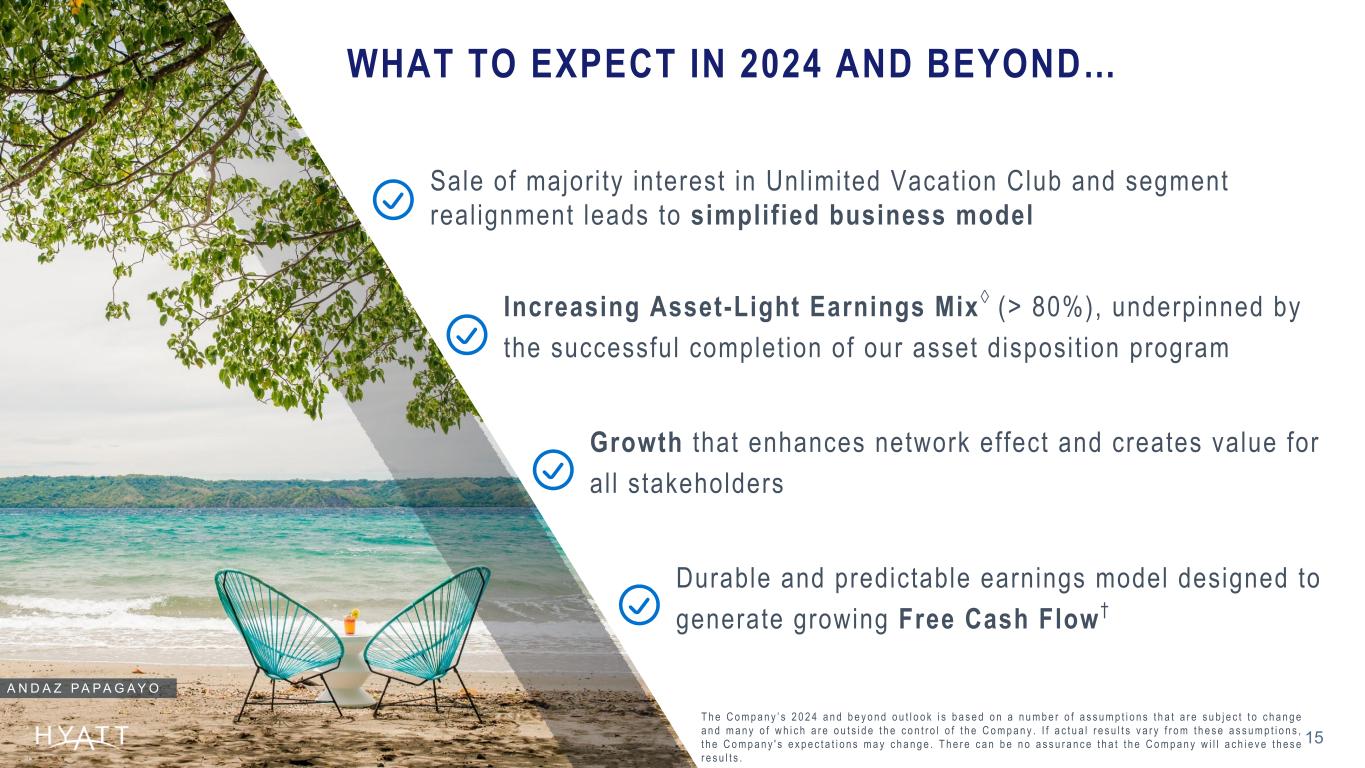 COMMITTED TO INVESTMENT GRADE 14 Senior Notes Maturit ies by Year Total Debt: $3.1B1 $M USD Credit Ratings BBB- Stab le BBB- Stab le Baa3 Stab le Liquidi ty $0.8B Cash, Cash Equ iva len ts , & Shor t -Term Inves tments $1.5B Revo lver Capac i ty Ava i lab le , Net o f Le t te rs o f Cred i t Outs tand ing STRONG POSIT ION WITH: H Y A T T P L A C E P A N A M A C I T Y B E A C H / B E A C H F R O N T T o t a l D e b t a n d L i q u i d i t y f i g u r e s a s o f M a r c h 3 1 , 2 0 2 4 . 1 C h a r t e x c l u d e s $ 2 7 m i l l i o n o f f l o a t i n g - r a t e d e b t , $ 5 m i l l i o n o f f i n a n c e l e a s e o b l i g a t i o n s , $ 1 2 m i l l i o n o f u n a m o r t i z e d d i s c o u n t s a n d d e f e r r e d f i n a n c i n g f e e s a s w e l l a s o u r r e v o l v i n g c r e d i t f a c i l i t y , w h i c h m a t u r e s i n 2 0 2 7 . A t M a r c h 3 1 , 2 0 2 4 , w e h a d $ 1 , 4 9 6 m i l l i o n o f b o r r o w i n g c a p a c i t y a v a i l a b l e u n d e r o u r r e v o l v i n g c r e d i t f a c i l i t y , n e t o f l e t t e r s o f c r e d i t o u t s t a n d i n g . $746 $450 $400 $600 $839 2024 2025 2026 2027 2028 & Beyond