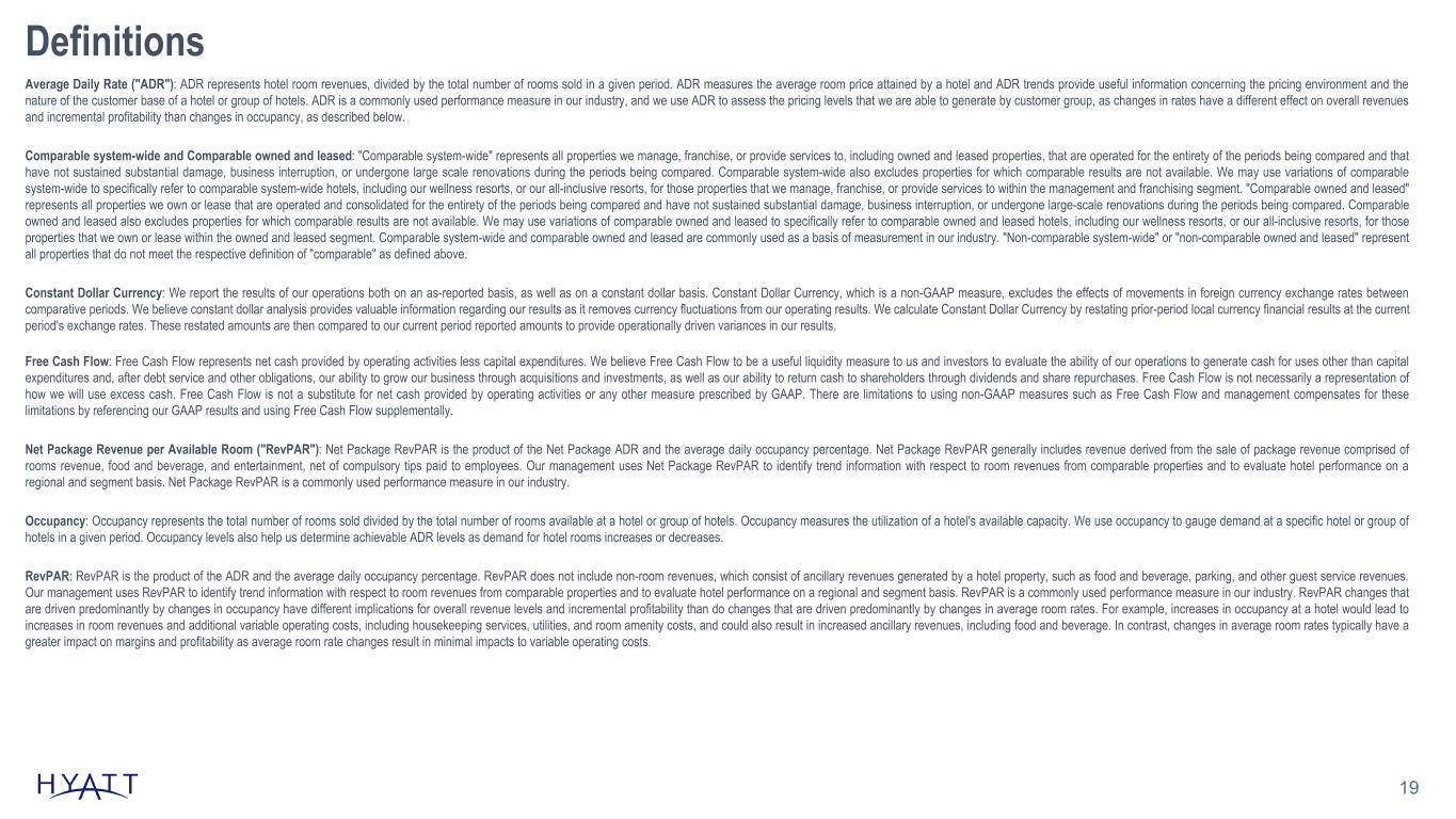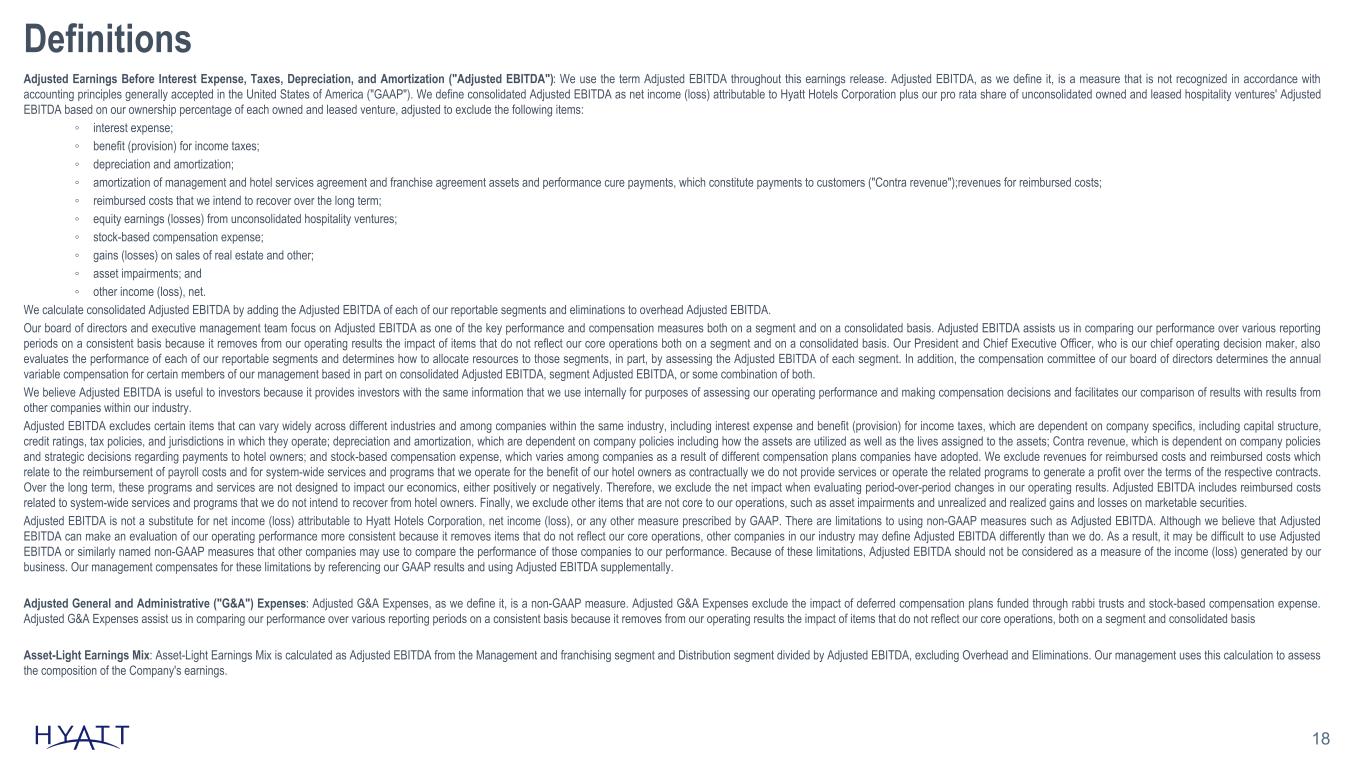18 Definitions Adjusted Earnings Before Interest Expense, Taxes, Depreciation, and Amortization ("Adjusted EBITDA"): We use the term Adjusted EBITDA throughout this earnings release. Adjusted EBITDA, as we define it, is a measure that is not recognized in accordance with accounting principles generally accepted in the United States of America ("GAAP"). We define consolidated Adjusted EBITDA as net income (loss) attributable to Hyatt Hotels Corporation plus our pro rata share of unconsolidated owned and leased hospitality ventures' Adjusted EBITDA based on our ownership percentage of each owned and leased venture, adjusted to exclude the following items: ◦ interest expense; ◦ benefit (provision) for income taxes; ◦ depreciation and amortization; ◦ amortization of management and hotel services agreement and franchise agreement assets and performance cure payments, which constitute payments to customers ("Contra revenue");revenues for reimbursed costs; ◦ reimbursed costs that we intend to recover over the long term; ◦ equity earnings (losses) from unconsolidated hospitality ventures; ◦ stock-based compensation expense; ◦ gains (losses) on sales of real estate and other; ◦ asset impairments; and ◦ other income (loss), net. We calculate consolidated Adjusted EBITDA by adding the Adjusted EBITDA of each of our reportable segments and eliminations to overhead Adjusted EBITDA. Our board of directors and executive management team focus on Adjusted EBITDA as one of the key performance and compensation measures both on a segment and on a consolidated basis. Adjusted EBITDA assists us in comparing our performance over various reporting periods on a consistent basis because it removes from our operating results the impact of items that do not reflect our core operations both on a segment and on a consolidated basis. Our President and Chief Executive Officer, who is our chief operating decision maker, also evaluates the performance of each of our reportable segments and determines how to allocate resources to those segments, in part, by assessing the Adjusted EBITDA of each segment. In addition, the compensation committee of our board of directors determines the annual variable compensation for certain members of our management based in part on consolidated Adjusted EBITDA, segment Adjusted EBITDA, or some combination of both. We believe Adjusted EBITDA is useful to investors because it provides investors with the same information that we use internally for purposes of assessing our operating performance and making compensation decisions and facilitates our comparison of results with results from other companies within our industry. Adjusted EBITDA excludes certain items that can vary widely across different industries and among companies within the same industry, including interest expense and benefit (provision) for income taxes, which are dependent on company specifics, including capital structure, credit ratings, tax policies, and jurisdictions in which they operate; depreciation and amortization, which are dependent on company policies including how the assets are utilized as well as the lives assigned to the assets; Contra revenue, which is dependent on company policies and strategic decisions regarding payments to hotel owners; and stock-based compensation expense, which varies among companies as a result of different compensation plans companies have adopted. We exclude revenues for reimbursed costs and reimbursed costs which relate to the reimbursement of payroll costs and for system-wide services and programs that we operate for the benefit of our hotel owners as contractually we do not provide services or operate the related programs to generate a profit over the terms of the respective contracts. Over the long term, these programs and services are not designed to impact our economics, either positively or negatively. Therefore, we exclude the net impact when evaluating period-over-period changes in our operating results. Adjusted EBITDA includes reimbursed costs related to system-wide services and programs that we do not intend to recover from hotel owners. Finally, we exclude other items that are not core to our operations, such as asset impairments and unrealized and realized gains and losses on marketable securities. Adjusted EBITDA is not a substitute for net income (loss) attributable to Hyatt Hotels Corporation, net income (loss), or any other measure prescribed by GAAP. There are limitations to using non-GAAP measures such as Adjusted EBITDA. Although we believe that Adjusted EBITDA can make an evaluation of our operating performance more consistent because it removes items that do not reflect our core operations, other companies in our industry may define Adjusted EBITDA differently than we do. As a result, it may be difficult to use Adjusted EBITDA or similarly named non-GAAP measures that other companies may use to compare the performance of those companies to our performance. Because of these limitations, Adjusted EBITDA should not be considered as a measure of the income (loss) generated by our business. Our management compensates for these limitations by referencing our GAAP results and using Adjusted EBITDA supplementally. Adjusted General and Administrative ("G&A") Expenses: Adjusted G&A Expenses, as we define it, is a non-GAAP measure. Adjusted G&A Expenses exclude the impact of deferred compensation plans funded through rabbi trusts and stock-based compensation expense. Adjusted G&A Expenses assist us in comparing our performance over various reporting periods on a consistent basis because it removes from our operating results the impact of items that do not reflect our core operations, both on a segment and consolidated basis Asset-Light Earnings Mix: Asset-Light Earnings Mix is calculated as Adjusted EBITDA from the Management and franchising segment and Distribution segment divided by Adjusted EBITDA, excluding Overhead and Eliminations. Our manageme