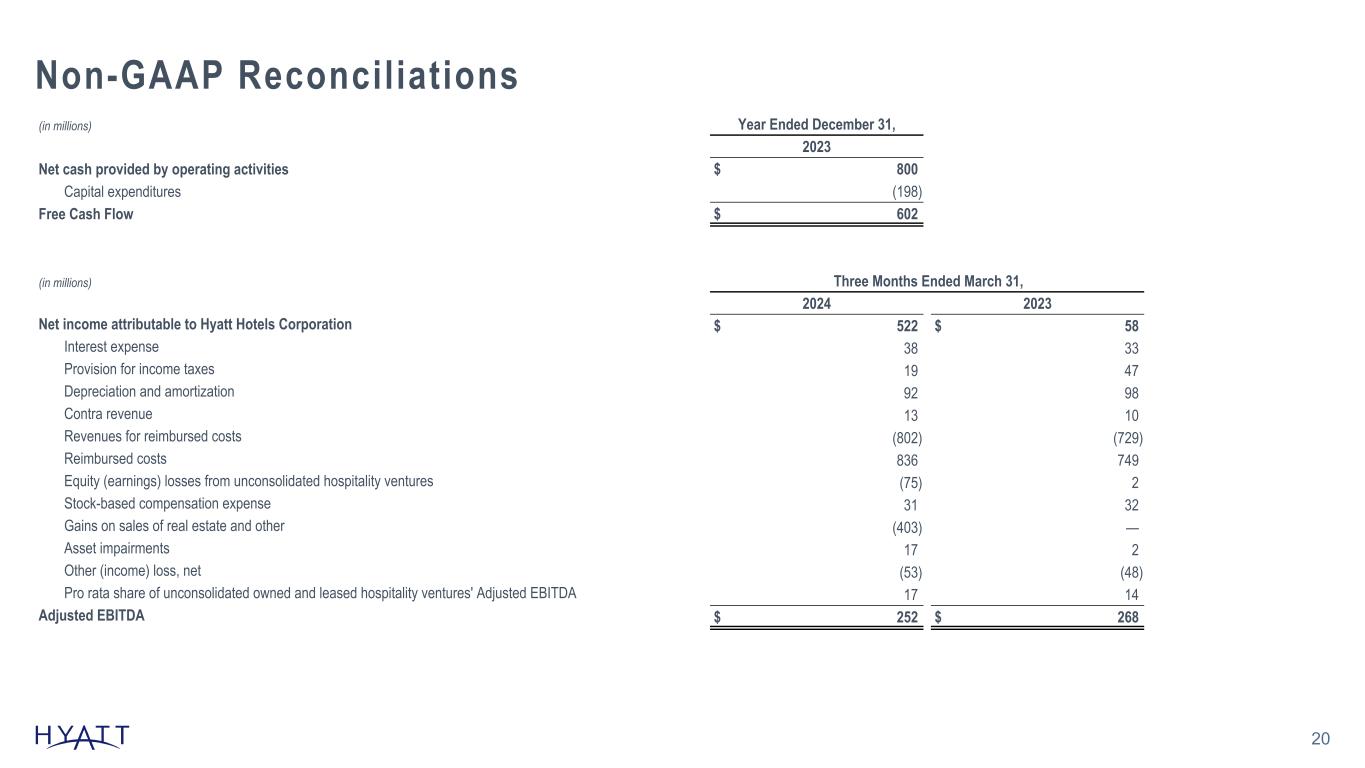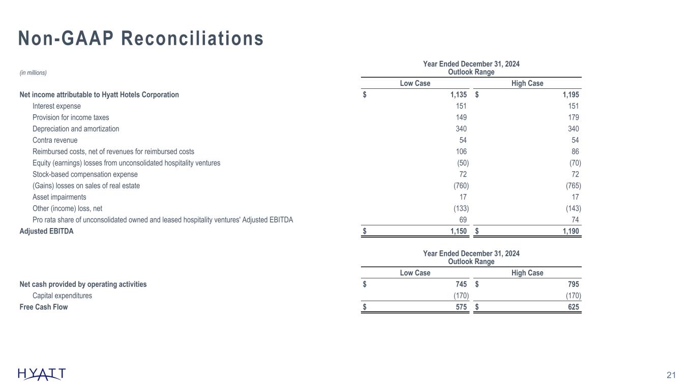Non-GAAP Reconciliations 20 (in millions) Year Ended December 31, 2023 Net cash provided by operating activities $ 800 Capital expenditures (198) Free Cash Flow $ 602 (in millions) Three Months Ended March 31, 2024 2023 Net income attributable to Hyatt Hotels Corporation $ 522 $ 58 Interest expense 38 33 Provision for income taxes 19 47 Depreciation and amortization 92 98 Contra revenue 13 10 Revenues for reimbursed costs (802) (729) Reimbursed costs 836 749 Equity (earnings) losses from unconsolidated hospitality ventures (75) 2 Stock-based compensation expense 31 32 Gains on sales of real estate and other (403) — Asset impairments 17 2 Other (income) loss, net (53) (48) Pro rata share of unconsolidated owned and leased hospitality ventures' Adjusted EBITDA 17 14 Adjusted EBITDA $ 252 $ 268