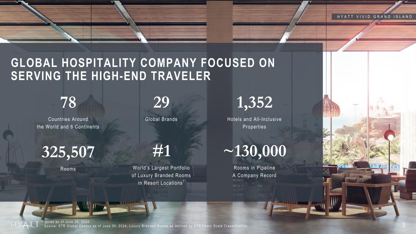 STRATEGIC GROWTH ACROSS MULTIPLE DIMENSIONS 4 +73%  +95%  +81%  +340%  +2,900 bps 20232017 20232017 20232017 20232017 20232017 SYSTEM-WIDE ROOMS GROSS FEE REVENUE PIPELINE LOYALTY MEMBERS ASSET-LIGHT EARNINGS MIX ◊1   186K 322K $970M $498M 127K 70K 44M 10M 76% 47% 1 A s s e t - L i g h t E a r n i n g s M i x ◊ i n c l u d e d N e t D e f e r r a l s a n d N e t F i n a n c e d C o n t r a c t s i n 2 0 2 3 . C a l c u l a t e d c o m p a r i s o n s b a s e d o n y e a r e n d s 2 0 1 7 a n d 2 0 2 3 . 2 0 1 7 g r o s s f e e r e v e n u e r e p r e s e n t s m a n a g e m e n t , f r a n c h i s e , a n d o t h e r f e e s f o l l o w i n g t h e a d o p t i o n o f A S C 6 0 6 d u r i n g t h e y e a r e n d e d D e c e m b e r 3 1 , 2 0 1 8 a s d i s c l o s e d i n o u r 2 0 1 8 F o r m 1 0 - K . 2 0 2 3 g r o s s f e e r e v e n u e s r e p r e s e n t s t h e r e c a s t f i g u r e s p r o v i d e d i n t h e s u p p l e m e n t a l f i n a n c i a l i n f o r m a t i o n o n F o r m 8 - K f i l e d o n A p r i l 2 5 , 2 0 2 4 . Source Notes: Updated Annually Support: Hyatt Hotels\CHICO-Team-Corporate FPA - Documents\Fact Pack and QA Document\2024\Investor Consideration Deck Support\Annual \ Strategic Growth support file -2009 Data can be found under 2009 folder System-wide rooms based on Inventory as of December 31, 2009 Fee Revenue, pipeline, and loyalty members based on Hyatt 2009 Annual Report -2017 Data can be found under 2017 folder System-wide rooms based on Inventory as of December 31, 2017 Fee Revenue and pipeline based on Q4 2017 Earnings Release Loyalty members based on 10-K 2017 -2023 Data System-wide rooms based on Inventory as of December 31, 2023 Fee Revenue and pipeline based on Q4 2023 Earnings Release Loyalty members based on 10-K 2023 as well as Enrollment and Program member count Q4 2023