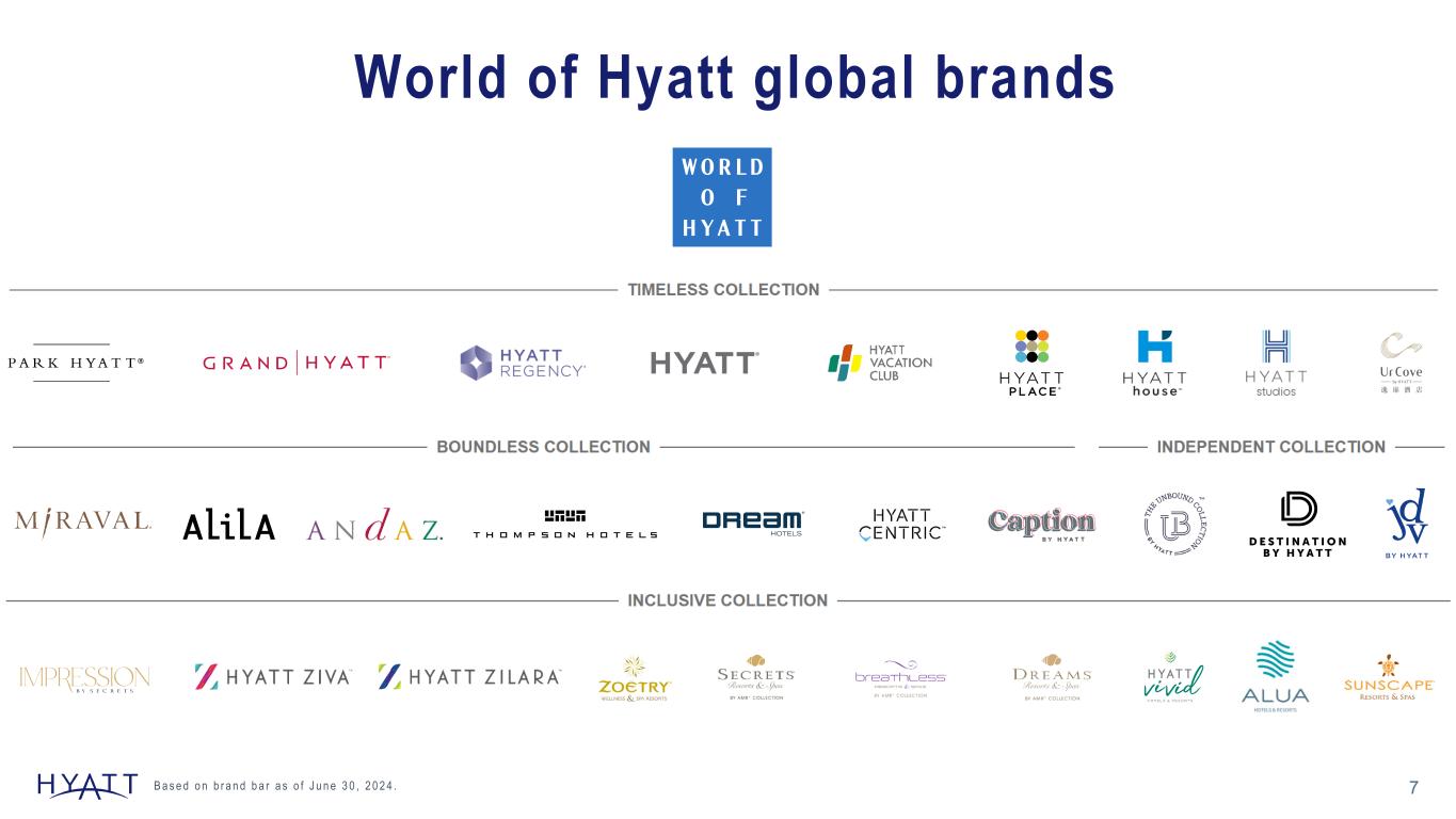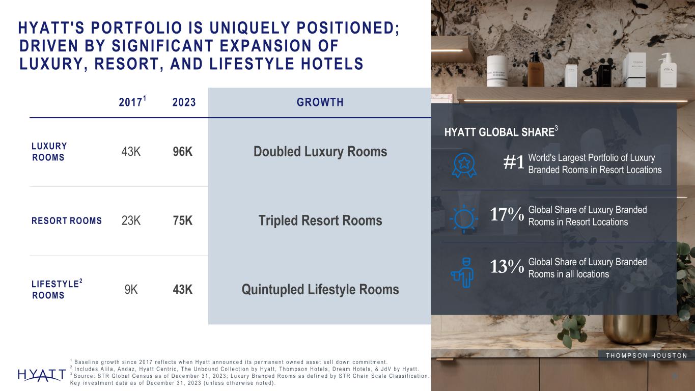 20171 2023 GROWTH LUXURY ROOMS 43K 96K Doubled Luxury Rooms RESORT ROOMS 23K 75K Tripled Resort Rooms LIFESTYLE2 ROOMS 9K 43K Quintupled Lifestyle Rooms HYATT'S PORTFOLIO IS UNIQUELY POSITIONED; DRIVEN BY SIGNIFICANT EXPANSION OF LUXURY, RESORT, AND LIFESTYLE HOTELS  6 HYATT GLOBAL SHARE3 #1 World's Largest Portfolio of Luxury Branded Rooms in Resort Locations 17% Global Share of Luxury Branded Rooms in Resort Locations 13% Global Share of Luxury Branded Rooms in all locations T H O M P S O N H O U S T O N 1 B a s e l i n e g r o w t h s i n c e 2 0 1 7 r e f l e c t s w h e n H y a t t a n n o u n c e d i t s p e r m a n e n t o w n e d a s s e t s e l l d o w n c o m m i t m e n t . 2 I n c l u d e s A l i l a , A n d a z , H y a t t C e n t r i c , T h e U n b o u n d C o l l e c t i o n b y H y a t t , T h o m p s o n H o t e l s , D r e a m H o t e l s , & J d V b y H y a t t . 3 S o u r c e : S T R G l o b a l C e n s u s a s o f D e c e m b e r 3 1 , 2 0 2 3 ; L u x u r y B r a n d e d R o o m s a s d e f i n e d b y S T R C h a i n S c a l e C l a s s i f i c a t i o n . K e y i n v e s t m e n t d a t a a s o f D e c e m b e r 3 1 , 2 0 2 3 ( u n l e s s o t h e r w i s e n o t e d ) . Source Notes: Updated Annually Support: Hyatt Hotels\CHICO-Team-Corporate FPA - Documents\Fact Pack and QA Document\202X\Investor Consideration Deck Support\Annual -Luxury, Lifestyle, and Resort rooms calculated based on HHC Inventory as of Year end and calculated based on Luxury Lifestyle or Resort Support file -Hyatt Global Share calculated based on STR census as of Year-end.