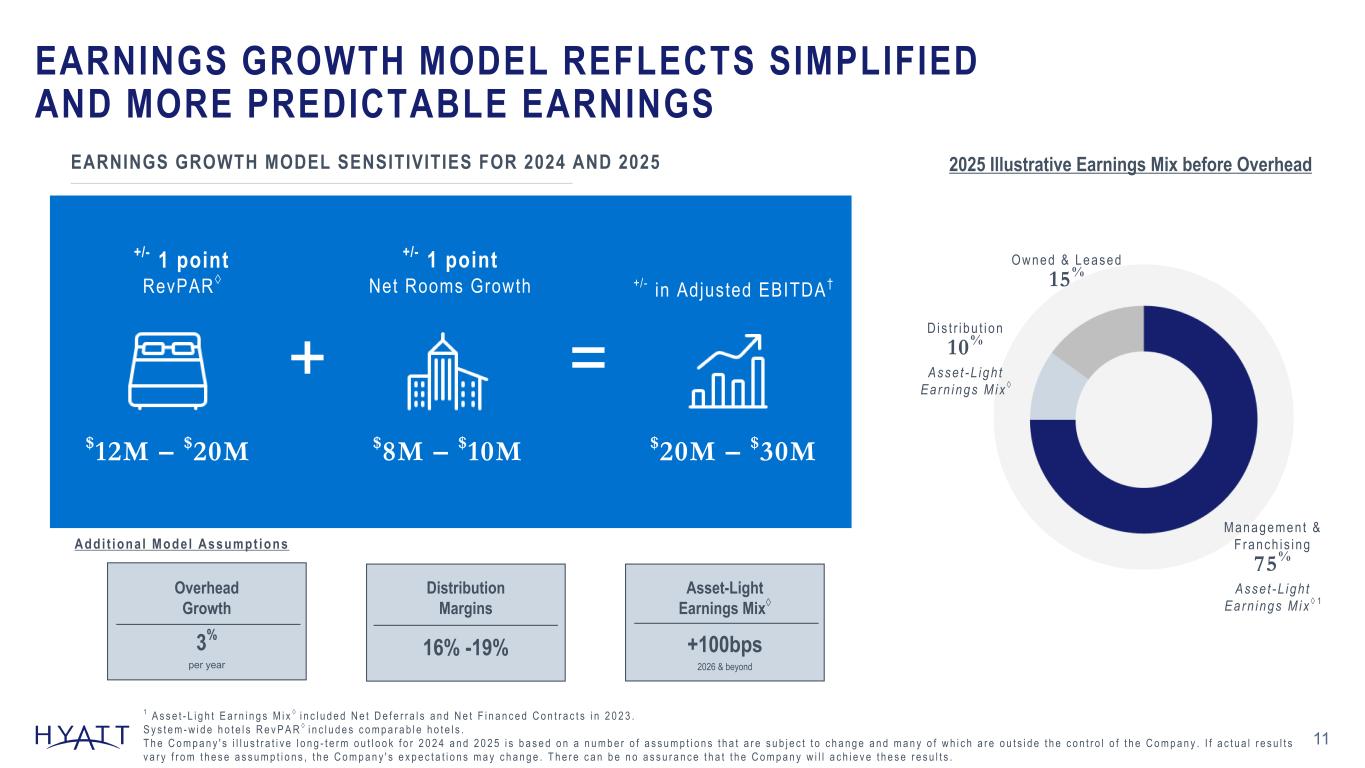 Disclaimers 2 Forward-Looking Statements in this presentation, which are not historical facts, are forward-looking statements within the meaning of the Private Securities Litigation Reform Act of 1995. These statements include statements about Hyatt Hotels Corporation’s (the “Company”) plans, strategies, outlook, the amount by which the Company intends to reduce its real estate asset base, the expected amount of gross proceeds from the sale of such assets, and the anticipated timeframe for such asset dispositions, the number of properties we expect to open in the future, our growth model, our credit rating expectations, our capital allocation plans, our expected Adjusted G&A Expense, our expected capital expenditures, our expected net income and Adjusted EBITDA, our expected net rooms growth, our expected system-wide RevPAR, our expected Free Cash Flow, financial performance, prospects or future events and involve known and unknown risks that are difficult to predict. As a result, our actual results, performance or achievements may differ materially from those expressed or implied by these forward-looking statements. In some cases, you can identify forward-looking statements by the use of words such as "may," "could," "expect," "intend," "plan," "seek," "anticipate," "believe," "estimate," "predict," "potential," "continue," "likely," "will," "would" and variations of these terms and similar expressions, or the negative of these terms or similar expressions. Such forward-looking statements are necessarily based upon estimates and assumptions that, while considered reasonable by us and our management, are inherently uncertain. Factors that may cause actual results to differ materially from current expectations include, but are not limited to: general economic uncertainty in key global markets and a worsening of global economic conditions or low levels of economic growth; the rate and pace of economic recovery following economic downturns; global supply chain constraints and interruptions, rising costs of construction-related labor and materials, and increases in costs due to inflation or other factors that may not be fully offset by increases in revenues in our business; risks affecting the luxury, resort, and all-inclusive lodging segments; levels of spending in business, leisure, and group segments, as well as consumer confidence; declines in occupancy and average daily rate; limited visibility with respect to future bookings; loss of key personnel; domestic and international political and geopolitical conditions, including political or civil unrest or changes in trade policy; hostilities, or fear of hostilities, including future terrorist attacks, that affect travel; travel-related accidents; natural or man-made disasters, weather and climate-related events, such as earthquakes, tsunamis, tornadoes, hurricanes, droughts, floods, wildfires, oil spills, nuclear incidents, and global outbreaks of pandemics or contagious diseases, or fear of such outbreaks; our ability to successfully achieve certain levels of operating profits at hotels that have performance tests or guarantees in favor of our third-party owners; the impact of hotel renovations and redevelopments; risks associated with our capital allocation plans, share repurchase program, and dividend payments, including a reduction in, or elimination or suspension of, repurchase activity or dividend payments; the seasonal and cyclical nature of the real estate and hospitality businesses; changes in distribution arrangements, such as through internet travel intermediaries; changes in the tastes and preferences of our customers; relationships with colleagues and labor unions and changes in labor laws; the financial condition of, and our relationships with, third-party owners, franchisees, and hospitality venture partners; the possible inability of third-party owners, franchisees, or development partners to access the capital necessary to fund current operations or implement our plans for growth; risks associated with potential acquisitions and dispositions and our ability to successfully integrate completed acquisitions with existing operations; failure to successfully complete proposed transactions (including the failure to satisfy closing conditions or obtain required approvals); our ability to successfully execute our strategy to expand our management and hotels services and franchising business while at the same time reducing our real estate asset base within targeted timeframes and at expected values; our ability to maintain effective internal control over financial reporting and disclosure controls and procedures; declines in the value of our real estate assets; unforeseen terminations of our management and hotels services or franchise agreements; changes in federal, state, local, or foreign tax law; increases in interest rates, wages, and other operating costs; foreign exchange rate fluctuations or currency restructurings; risks associated with the introduction of new brand concepts, including lack of acceptance of new brands or innovation; general volatility of the capital markets and our ability to access such markets; changes in the competitive environment in our industry, industry consolidation, and the markets where we operate; our ability to successfully grow the World of Hyatt loyalty program and Unlimited Vacation Club paid membership program; cyber incidents and information technology failures; outcomes of legal or administrative proceedings; and violations of regulations or laws related to our franchising business and licensing businesses and our international operations; and other risks discussed in the Company's filings with the SEC, including our annual reports on Form 10-K and quarterly reports on Form 10-Q, which filings are available from the SEC. All forward-looking statements attributable to us or persons acting on our behalf are expressly qualified in their entirety by the cautionary statements set forth a