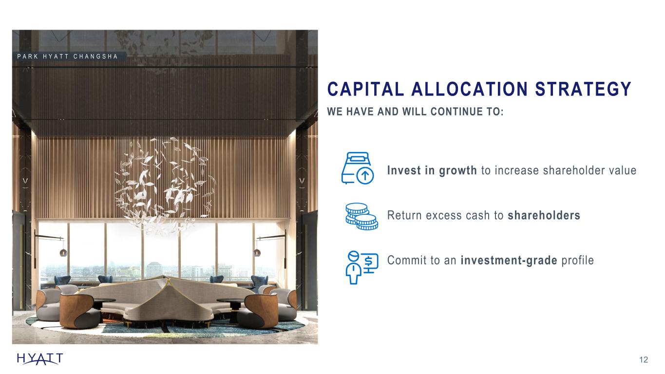 EARNINGS GROWTH MODEL REFLECTS SIMPLIFIED AND MORE PREDICTABLE EARNINGS 11 EARNINGS GROWTH MODEL SENSITIVITIES FOR 2024 AND 2025 +/- 1 point RevPAR◊ +/- in Adjusted EBITDA† $20M – $30M + = Addi t iona l Mode l Assumpt ions 2025 Illustrative Earnings Mix before Overhead Asset-Light Earnings Mix◊ +100bps 2026 & beyond Managemen t & F ranch i s i ng 75% Asse t -L igh t Ea rn ings M ix ◊ 1 Dis t r i bu t i on 10% Asse t -L igh t Ea rn ings M ix ◊ Owned & Leased 15% +/- 1 point Net Rooms Growth $12M – $20M $8M – $10M Distribution Margins Overhead Growth 3% per year 2026 & BEYOND: +100bps increase in asset-light earnings per year 1 A s s e t - L i g h t E a r n i n g s M i x ◊ i n c l u d e d N e t D e f e r r a l s a n d N e t F i n a n c e d C o n t r a c t s i n 2 0 2 3 . S y s t e m - w i d e h o t e l s R e v P A R ◊ i n c l u d e s c o m p a r a b l e h o t e l s . T h e C o m p a n y ' s i l l u s t r a t i v e l o n g - t e r m o u t l o o k f o r 2 0 2 4 a n d 2 0 2 5 i s b a s e d o n a n u m b e r o f a s s u m p t i o n s t h a t a r e s u b j e c t t o c h a n g e a n d m a n y o f w h i c h a r e o u t s i d e t h e c o n t r o l o f t h e C o m p a n y . I f a c t u a l r e s u l t s v a r y f r o m t h e s e a s s u m p t i o n s , t h e C o m p a n y ' s e x p e c t a t i o n s m a y c h a n g e . T h e r e c a n b e n o a s s u r a n c e t h a t t h e C o m p a n y w i l l a c h i e v e t h e s e r e s u l t s . 16% -19% Source Notes: