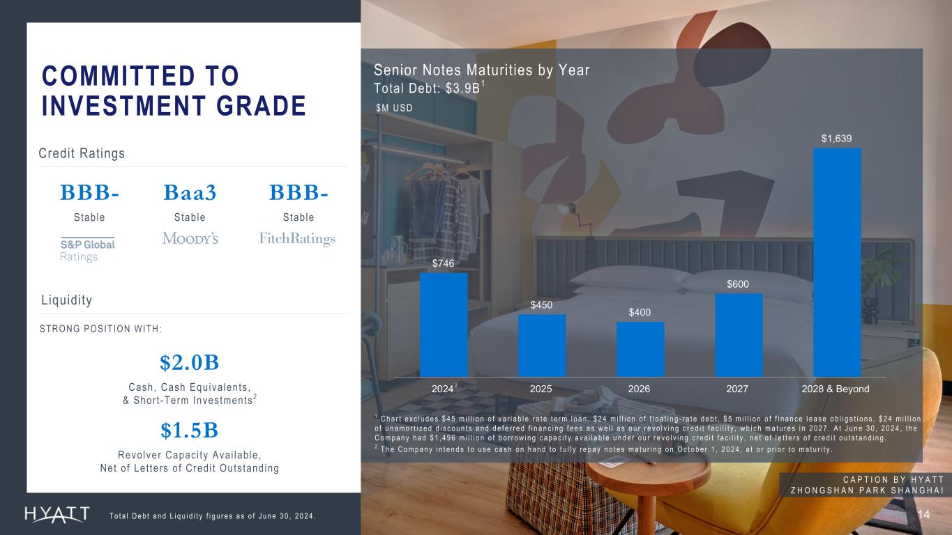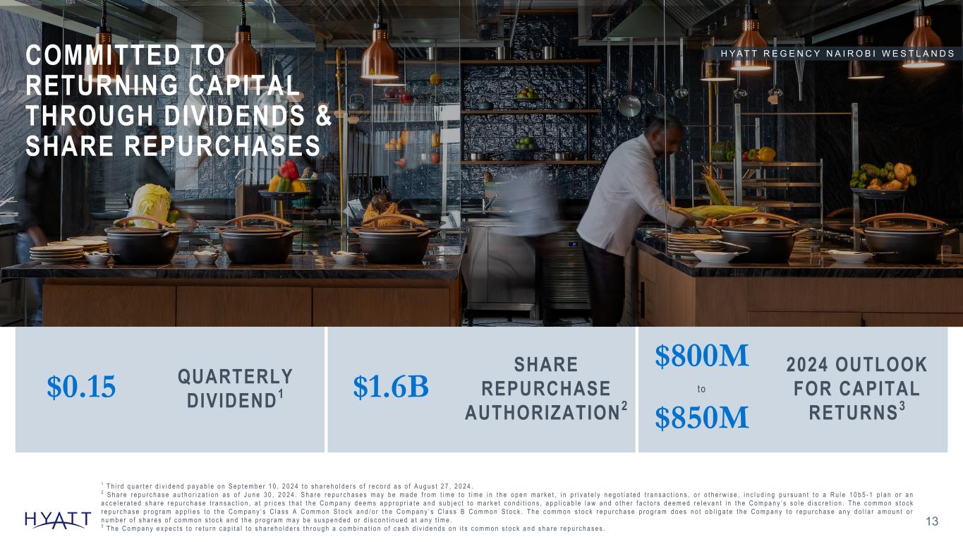 $0.15 QUARTERLY DIVIDEND1 $1.6B SHARE REPURCHASE AUTHORIZATION2 $800M t o $850M 2024 OUTLOOK FOR CAPITAL RETURNS3 COMMITTED TO RETURNING CAPITAL THROUGH DIVIDENDS & SHARE REPURCHASES   13 H Y A T T R E G E N C Y N A I R O B I W E S T L A N D S 1 T h i r d q u a r t e r d i v i d e n d p a y a b l e o n S e p t e m b e r 1 0 , 2 0 2 4 t o s h a r e h o l d e r s o f r e c o r d a s o f A u g u s t 2 7 , 2 0 2 4 . 2 S h a r e r e p u r c h a s e a u t h o r i z a t i o n a s o f J u n e 3 0 , 2 0 2 4 . S h a r e r e p u r c h a s e s m a y b e m a d e f r o m t i m e t o t i m e i n t h e o p e n m a r k e t , i n p r i v a t e l y n e g o t i a t e d t r a n s a c t i o n s , o r o t h e r w i s e , i n c l u d i n g p u r s u a n t t o a R u l e 1 0 b 5 - 1 p l a n o r a n a c c e l e r a t e d s h a r e r e p u r c h a s e t r a n s a c t i o n , a t p r i c e s t h a t t h e C o m p a n y d e e m s a p p r o p r i a t e a n d s u b j e c t t o m a r k e t c o n d i t i o n s , a p p l i c a b l e l a w a n d o t h e r f a c t o r s d e e m e d r e l e v a n t i n t h e C o m p a n y ’ s s o l e d i s c r e t i o n . T h e c o m m o n s t o c k r e p u r c h a s e p r o g r a m a p p l i e s t o t h e C o m p a n y ’ s C l a s s A C o m m o n S t o c k a n d / o r t h e C o m p a n y ’ s C l a s s B C o m m o n S t o c k . T h e c o m m o n s t o c k r e p u r c h a s e p r o g r a m d o e s n o t o b l i g a t e t h e C o m p a n y t o r e p u r c h a s e a n y d o l l a r a m o u n t o r n u m b e r o f s h a r e s o f c o m m o n s t o c k a n d t h e p r o g r a m m a y b e s u s p e n d e d o r d i s c o n t i n u e d a t a n y t i m e . 3 T h e C o m p a n y e x p e c t s t o r e t u r n c a p i t a l t o s h a r e h o l d e r s t h r o u g h a c o m b i n a t i o n o f c a s h d i v i d e n d s o n i t s c o m m o n s t o c k a n d s h a r e r e p u r c h a s e s . Source Notes: