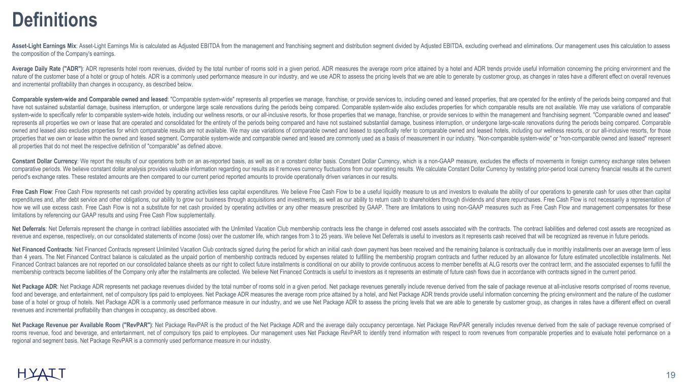 19 Definitions Asset-Light Earnings Mix: Asset-Light Earnings Mix is calculated as Adjusted EBITDA from the management and franchising segment and distribution segment divided by Adjusted EBITDA, excluding overhead and eliminations. Our management uses this calculation to assess the composition of the Company's earnings. Average Daily Rate ("ADR"): ADR represents hotel room revenues, divided by the total number of rooms sold in a given period. ADR measures the average room price attained by a hotel and ADR trends provide useful information concerning the pricing environment and the nature of the customer base of a hotel or group of hotels. ADR is a commonly used performance measure in our industry, and we use ADR to assess the pricing levels that we are able to generate by customer group, as changes in rates have a different effect on overall revenues and incremental profitability than changes in occupancy, as described below. Comparable system-wide and Comparable owned and leased: "Comparable system-wide" represents all properties we manage, franchise, or provide services to, including owned and leased properties, that are operated for the entirety of the periods being compared and that have not sustained substantial damage, business interruption, or undergone large scale renovations during the periods being compared. Comparable system-wide also excludes properties for which comparable results are not available. We may use variations of comparable system-wide to specifically refer to comparable system-wide hotels, including our wellness resorts, or our all-inclusive resorts, for those properties that we manage, franchise, or provide services to within the management and franchising segment. "Comparable owned and leased" represents all properties we own or lease that are operated and consolidated for the entirety of the periods being compared and have not sustained substantial damage, business interruption, or undergone large-scale renovations during the periods being compared. Comparable owned and leased also excludes properties for which comparable results are not available. We may use variations of comparable owned and leased to specifically refer to comparable owned and leased hotels, including our wellness resorts, or our all-inclusive resorts, for those properties that we own or lease within the owned and leased segment. Comparable system-wide and comparable owned and leased are commonly used as a basis of measurement in our industry. "Non-comparable system-wide" or "non-comparable owned and leased" represent all properties that do not meet the respective definition of "comparable" as defined above. Constant Dollar Currency: We report the results of our operations both on an as-reported basis, as well as on a constant dollar basis. Constant Dollar Currency, which is a non-GAAP measure, excludes the effects of movements in foreign currency exchange rates between comparative periods. We believe constant dollar analysis provides valuable information regarding our results as it removes currency fluctuations from our operating results. We calculate Constant Dollar Currency by restating prior-period local currency financial results at the current period's exchange rates. These restated amounts are then compared to our current period reported amounts to provide operationally driven variances in our results. Free Cash Flow: Free Cash Flow represents net cash provided by operating activities less capital expenditures. We believe Free Cash Flow to be a useful liquidity measure to us and investors to evaluate the ability of our operations to generate cash for uses other than capital expenditures and, after debt service and other obligations, our ability to grow our business through acquisitions and investments, as well as our ability to return cash to shareholders through dividends and share repurchases. Free Cash Flow is not necessarily a representation of how we will use excess cash. Free Cash Flow is not a substitute for net cash provided by operating activities or any other measure prescribed by GAAP. There are limitations to using non-GAAP measures such as Free Cash Flow and management compensates for these limitations by referencing our GAAP results and using Free Cash Flow supplementally. Net Deferrals: Net Deferrals represent the change in contract liabilities associated with the Unlimited Vacation Club membership contracts less the change in deferred cost assets associated with the contracts. The contract liabilities and deferred cost assets are recognized as revenue and expense, respectively, on our consolidated statements of income (loss) over the customer life, which ranges from 3 to 25 years. We believe Net Deferrals is useful to investors as it represents cash received that will be recognized as revenue in future periods. Net Financed Contracts: Net Financed Contracts represent Unlimited Vacation Club contracts signed during the period for which an initial cash down payment has been received and the remaining balance is contractually due in monthly installments over an average term of less than 4 years. The Net Financed Contract balance is calculated as the unpaid portion of membership contracts reduced by expenses related to fulfilling the membership program contracts and further reduced by an allowance for future estimated uncollectible installments. Net Financed Contract balances are not reported on our consolidated balance sheets as our right to collect future installments is conditional on our ability to provide continuous access to member benefits at ALG resorts over the contract term, and the associated expenses to fulfill the membership contracts become liabilities of the Company only after the installments are collected. We believe Net Financed Contracts is useful to investors as it represents an estimate of future cash flows due in accordance with contracts signed in the current period. Net Package ADR: Net Package ADR represents net package revenues divided by the tot