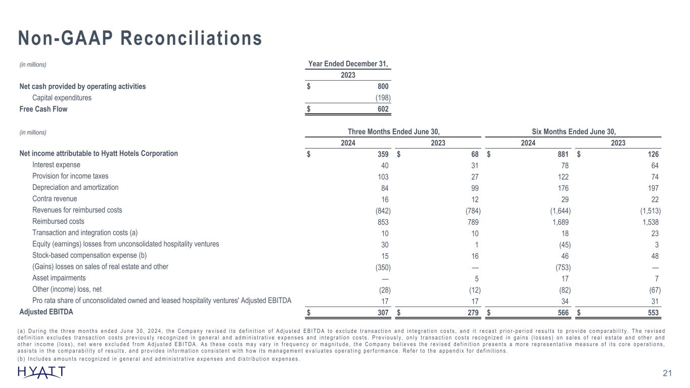 Non-GAAP Reconciliations 22 (in millions) Year Ended December 31, 2024 Outlook Range Low Case High Case Net income attributable to Hyatt Hotels Corporation $ 1,055 $ 1,115 Interest expense 175 175 Provision for income taxes 161 191 Depreciation and amortization 345 345 Contra revenue 56 56 Reimbursed costs, net of revenues for reimbursed costs 108 98 Transaction and integration costs 26 21 Equity (earnings) losses from unconsolidated hospitality ventures (41) (61) Stock-based compensation expense 73 73 (Gains) losses on sales of real estate (748) (758) Asset impairments 17 17 Other (income) loss, net (157) (167) Pro rata share of unconsolidated owned and leased hospitality ventures' Adjusted EBITDA 65 70 Adjusted EBITDA $ 1,135 $ 1,175 Year Ended December 31, 2024 Outlook Range Low Case High Case Net cash provided by operating activities $ 730 $ 780 Capital expenditures (170) (170) Free Cash Flow $ 560 $ 610 Source Notes: linked to ER schedule
