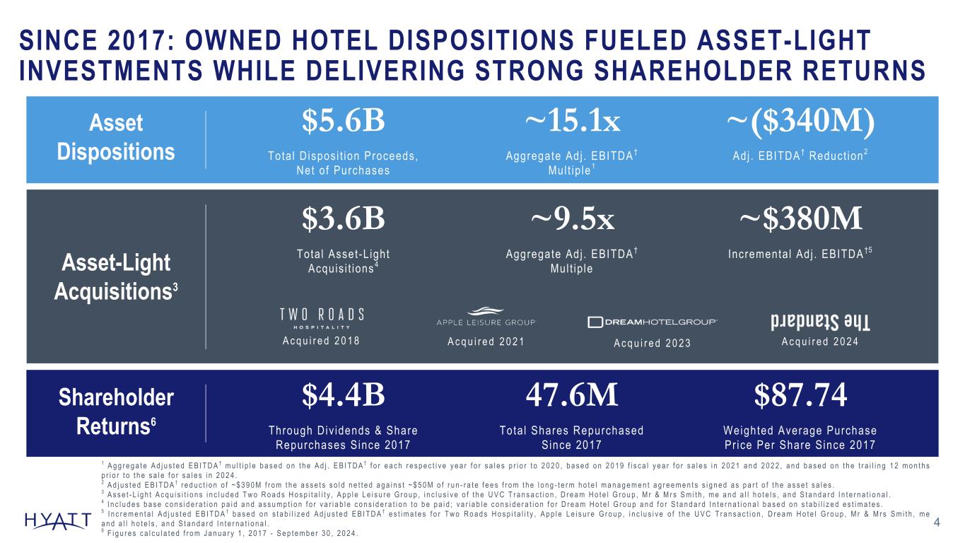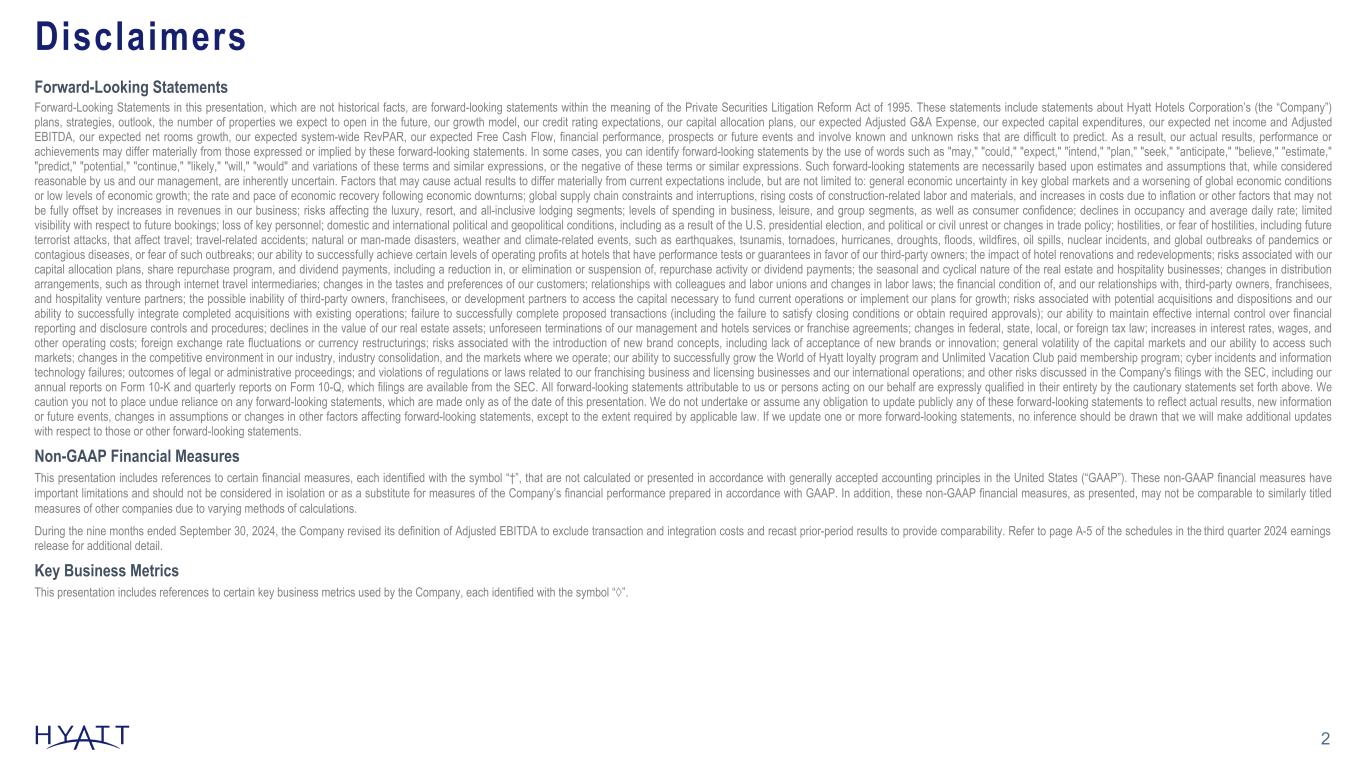Disclaimers 2 Forward-Looking Statements in this presentation, which are not historical facts, are forward-looking statements within the meaning of the Private Securities Litigation Reform Act of 1995. These statements include statements about Hyatt Hotels Corporation’s (the “Company”) plans, strategies, outlook, the number of properties we expect to open in the future, our growth model, our credit rating expectations, our capital allocation plans, our expected Adjusted G&A Expense, our expected capital expenditures, our expected net income and Adjusted EBITDA, our expected net rooms growth, our expected system-wide RevPAR, our expected Free Cash Flow, financial performance, prospects or future events and involve known and unknown risks that are difficult to predict. As a result, our actual results, performance or achievements may differ materially from those expressed or implied by these forward-looking statements. In some cases, you can identify forward-looking statements by the use of words such as "may," "could," "expect," "intend," "plan," "seek," "anticipate," "believe," "estimate," "predict," "potential," "continue," "likely," "will," "would" and variations of these terms and similar expressions, or the negative of these terms or similar expressions. Such forward-looking statements are necessarily based upon estimates and assumptions that, while considered reasonable by us and our management, are inherently uncertain. Factors that may cause actual results to differ materially from current expectations include, but are not limited to: general economic uncertainty in key global markets and a worsening of global economic conditions or low levels of economic growth; the rate and pace of economic recovery following economic downturns; global supply chain constraints and interruptions, rising costs of construction-related labor and materials, and increases in costs due to inflation or other factors that may not be fully offset by increases in revenues in our business; risks affecting the luxury, resort, and all-inclusive lodging segments; levels of spending in business, leisure, and group segments, as well as consumer confidence; declines in occupancy and average daily rate; limited visibility with respect to future bookings; loss of key personnel; domestic and international political and geopolitical conditions, including as a result of the U.S. presidential election, and political or civil unrest or changes in trade policy; hostilities, or fear of hostilities, including future terrorist attacks, that affect travel; travel-related accidents; natural or man-made disasters, weather and climate-related events, such as earthquakes, tsunamis, tornadoes, hurricanes, droughts, floods, wildfires, oil spills, nuclear incidents, and global outbreaks of pandemics or contagious diseases, or fear of such outbreaks; our ability to successfully achieve certain levels of operating profits at hotels that have performance tests or guarantees in favor of our third-party owners; the impact of hotel renovations and redevelopments; risks associated with our capital allocation plans, share repurchase program, and dividend payments, including a reduction in, or elimination or suspension of, repurchase activity or dividend payments; the seasonal and cyclical nature of the real estate and hospitality businesses; changes in distribution arrangements, such as through internet travel intermediaries; changes in the tastes and preferences of our customers; relationships with colleagues and labor unions and changes in labor laws; the financial condition of, and our relationships with, third-party owners, franchisees, and hospitality venture partners; the possible inability of third-party owners, franchisees, or development partners to access the capital necessary to fund current operations or implement our plans for growth; risks associated with potential acquisitions and dispositions and our ability to successfully integrate completed acquisitions with existing operations; failure to successfully complete proposed transactions (including the failure to satisfy closing conditions or obtain required approvals); our ability to maintain effective internal control over financial reporting and disclosure controls and procedures; declines in the value of our real estate assets; unforeseen terminations of our management and hotels services or franchise agreements; changes in federal, state, local, or foreign tax law; increases in interest rates, wages, and other operating costs; foreign exchange rate fluctuations or currency restructurings; risks associated with the introduction of new brand concepts, including lack of acceptance of new brands or innovation; general volatility of the capital markets and our ability to access such markets; changes in the competitive environment in our industry, industry consolidation, and the markets where we operate; our ability to successfully grow the World of Hyatt loyalty program and Unlimited Vacation Club paid membership program; cyber incidents and information technology failures; outcomes of legal or administrative proceedings; and violations of regulations or laws related to our franchising business and licensing businesses and our international operations; and other risks discussed in the Company's filings with the SEC, including our annual reports on Form 10-K and quarterly reports on Form 10-Q, which filings are available from the SEC. All forward-looking statements attributable to us or persons acting on our behalf are expressly qualified in their entirety by the cautionary statements set forth above. We caution you not to place undue reliance on any forward-looking statements, which are made only as of the date of this presentation. We do not undertake or assume any obligation to update publicly any of these forward-looking statements to reflect actual results, new information or future events, changes in assumptions or changes in other factors affecting forward-looking 