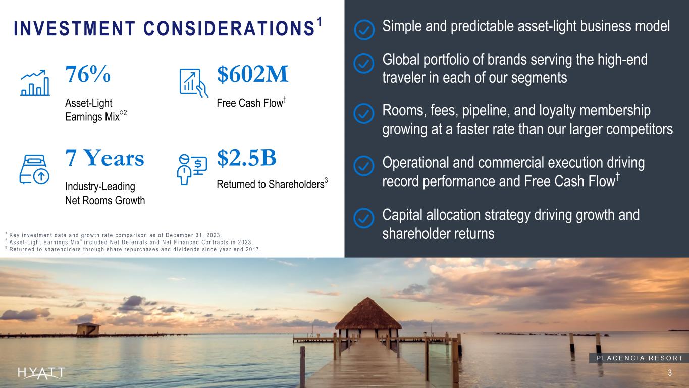 INVESTMENT CONSIDERATIONS 1 3 76% Asset-Light Earnings Mix◊2 7 Years Industry-Leading Net Rooms Growth Simple and predictable asset-light business model Global portfolio of brands serving the high-end traveler in each of our segments Rooms, fees, pipeline, and loyalty membership growing at a faster rate than our larger competitors Operational and commercial execution driving record performance and Free Cash Flow† Capital allocation strategy driving growth and shareholder returns $2.5B Returned to Shareholders3 $602M Free Cash Flow† 1 K e y i n v e s t m e n t d a t a a n d g r o w t h r a t e c o m p a r i s o n a s o f D e c e m b e r 3 1 , 2 0 2 3 . 2 A s s e t - L i g h t E a r n i n g s M i x ◊ i n c l u d e d N e t D e f e r r a l s a n d N e t F i n a n c e d C o n t r a c t s i n 2 0 2 3 . 3 R e t u r n e d t o s h a r e h o l d e r s t h r o u g h s h a r e r e p u r c h a s e s a n d d i v i d e n d s s i n c e y e a r e n d 2 0 1 7 . Source Notes: P L A C E N C I A R E S O R T