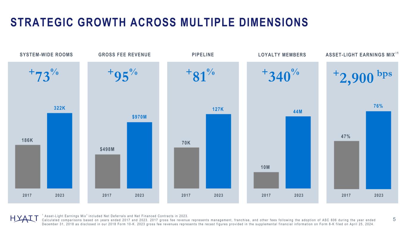 4 A c q u i r e d 2 0 1 8 A c q u i r e d 2 0 2 1 A c q u i r e d 2 0 2 3 A c q u i r e d 2 0 2 4 Acquired 2017 1 A g g r e g a t e A d j u s t e d E B I T D A † m u l t i p l e b a s e d o n t h e A d j . E B I T D A † f o r e a c h r e s p e c t i v e y e a r f o r s a l e s p r i o r t o 2 0 2 0 , b a s e d o n 2 0 1 9 f i s c a l y e a r f o r s a l e s i n 2 0 2 1 a n d 2 0 2 2 , a n d b a s e d o n t h e t r a i l i n g 1 2 m o n t h s p r i o r t o t h e s a l e f o r s a l e s i n 2 0 2 4 . 2 A d j u s t e d E B I T D A † r e d u c t i o n o f ~ $ 3 9 0 M f r o m t h e a s s e t s s o l d n e t t e d a g a i n s t ~ $ 5 0 M o f r u n - r a t e f e e s f r o m t h e l o n g - t e r m h o t e l m a n a g e m e n t a g r e e m e n t s s i g n e d a s p a r t o f t h e a s s e t s a l e s . 3 A s s e t - L i g h t A c q u i s i t i o n s i n c l u d e d T w o R o a d s H o s p i t a l i t y , A p p l e L e i s u r e G r o u p , i n c l u s i v e o f t h e U V C T r a n s a c t i o n , D r e a m H o t e l G r o u p , M r & M r s S m i t h , m e a n d a l l h o t e l s , a n d S t a n d a r d I n t e r n a t i o n a l . 4 I n c l u d e s b a s e c o n s i d e r a t i o n p a i d a n d a s s u m p t i o n f o r v a r i a b l e c o n s i d e r a t i o n t o b e p a i d ; v a r i a b l e c o n s i d e r a t i o n f o r D r e a m H o t e l G r o u p a n d f o r S t a n d a r d I n t e r n a t i o n a l b a s e d o n s t a b i l i z e d e s t i m a t e s . 5 I n c r e m e n t a l A d j u s t e d E B I T D A † b a s e d o n s t a b i l i z e d A d j u s t e d E B I T D A † e s t i m a t e s f o r T w o R o a d s H o s p i t a l i t y , A p p l e L e i s u r e G r o u p , i n c l u s i v e o f t h e U V C T r a n s a c t i o n , D r e a m H o t e l G r o u p , M r & M r s S m i t h , m e a n d a l l h o t e l s , a n d S t a n d a r d I n t e r n a t i o n a l . 6 F i g u r e s c a l c u l a t e d f r o m J a n u a r y 1 , 2 0 1 7 - S e p t e m b e r 3 0 , 2 0 2 4 . SINCE 2017: OWNED HOTEL DISPOSITIONS FUELED ASSET-LIGHT INVESTMENTS WHILE DELIVERING STRONG SHAREHOLDER RETURNS $5.6B Tota l D ispos i t ion Proceeds, Net o f Purchases ~15.1x Aggregate Ad j . EBITDA † Mul t ip le 1 Asset Dispositions ~($340M) Adj . EBITDA † Reduct ion 2 $3.6B Tota l Asset -L ight Acqu is i t ions 4 ~9.5x Aggregate Ad j . EBITDA † Mul t ip leAsset-Light Acquisitions3 ~$380M Incrementa l Ad j . EBITDA †5 $4.4B Through Div idends & Share Repurchases S ince 2017 Shareholder Returns6 47.6M Tota l Shares Repurchased S ince 2017 $87.74 Weighted Average Purchase Pr ice Per Share S ince 2017