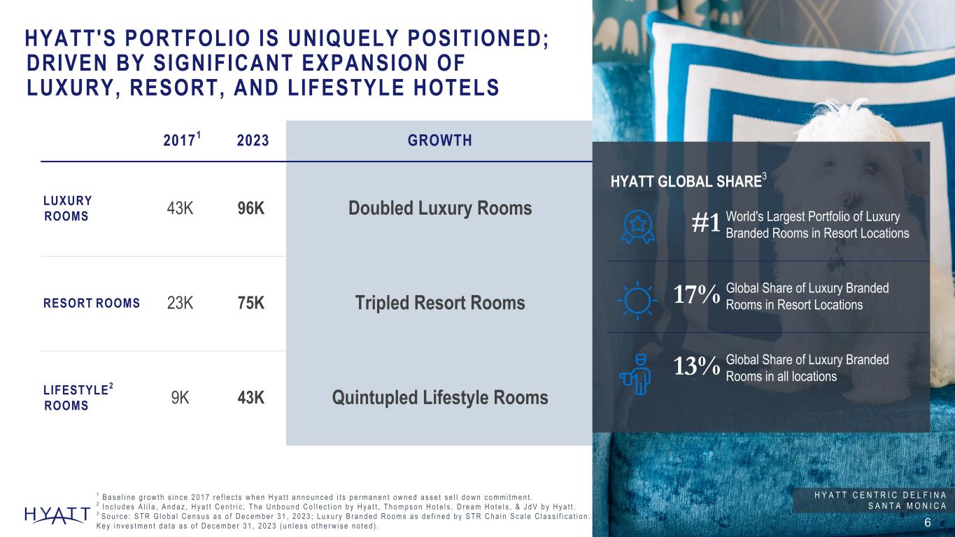 STRATEGIC GROWTH ACROSS MULTIPLE DIMENSIONS 5 +73%  +95%  +81%  +340%  +2,900 bps 20232017 20232017 20232017 20232017 20232017 SYSTEM-WIDE ROOMS GROSS FEE REVENUE PIPELINE LOYALTY MEMBERS ASSET-LIGHT EARNINGS MIX ◊1   186K 322K $970M $498M 127K 70K 44M 10M 76% 47% 1 A s s e t - L i g h t E a r n i n g s M i x ◊ i n c l u d e d N e t D e f e r r a l s a n d N e t F i n a n c e d C o n t r a c t s i n 2 0 2 3 . C a l c u l a t e d c o m p a r i s o n s b a s e d o n y e a r s e n d e d 2 0 1 7 a n d 2 0 2 3 . 2 0 1 7 g r o s s f e e r e v e n u e r e p r e s e n t s m a n a g e m e n t , f r a n c h i s e , a n d o t h e r f e e s f o l l o w i n g t h e a d o p t i o n o f A S C 6 0 6 d u r i n g t h e y e a r e n d e d D e c e m b e r 3 1 , 2 0 1 8 a s d i s c l o s e d i n o u r 2 0 1 8 F o r m 1 0 - K . 2 0 2 3 g r o s s f e e r e v e n u e s r e p r e s e n t s t h e r e c a s t f i g u r e s p r o v i d e d i n t h e s u p p l e m e n t a l f i n a n c i a l i n f o r m a t i o n o n F o r m 8 - K f i l e d o n A p r i l 2 5 , 2 0 2 4 . Source Notes: Updated Annually Support: Hyatt Hotels\CHICO-Team-Corporate FPA - Documents\Fact Pack and QA Document\2024\Investor Consideration Deck Support\Annual \ Strategic Growth support file -2009 Data can be found under 2009 folder System-wide rooms based on Inventory as of December 31, 2009 Fee Revenue, pipeline, and loyalty members based on Hyatt 2009 Annual Report -2017 Data can be found under 2017 folder System-wide rooms based on Inventory as of December 31, 2017 Fee Revenue and pipeline based on Q4 2017 Earnings Release Loyalty members based on 10-K 2017 -2023 Data System-wide rooms based on Inventory as of December 31, 2023 Fee Revenue and pipeline based on Q4 2023 Earnings Release Loyalty members based on 10-K 2023 as well as Enrollment and Program member count Q4 2023