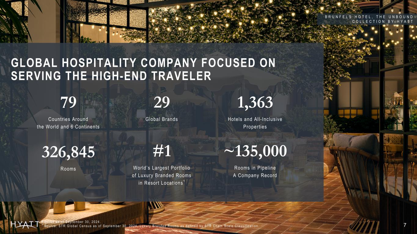 20171 2023 GROWTH LUXURY ROOMS 43K 96K Doubled Luxury Rooms RESORT ROOMS 23K 75K Tripled Resort Rooms LIFESTYLE2 ROOMS 9K 43K Quintupled Lifestyle Rooms HYATT'S PORTFOLIO IS UNIQUELY POSITIONED; DRIVEN BY SIGNIFICANT EXPANSION OF LUXURY, RESORT, AND LIFESTYLE HOTELS  6 HYATT GLOBAL SHARE3 #1 World's Largest Portfolio of Luxury Branded Rooms in Resort Locations 17% Global Share of Luxury Branded Rooms in Resort Locations 13% Global Share of Luxury Branded Rooms in all locations H Y A T T C E N T R I C D E L F I N A S A N T A M O N I C A 1 B a s e l i n e g r o w t h s i n c e 2 0 1 7 r e f l e c t s w h e n H y a t t a n n o u n c e d i t s p e r m a n e n t o w n e d a s s e t s e l l d o w n c o m m i t m e n t . 2 I n c l u d e s A l i l a , A n d a z , H y a t t C e n t r i c , T h e U n b o u n d C o l l e c t i o n b y H y a t t , T h o m p s o n H o t e l s , D r e a m H o t e l s , & J d V b y H y a t t . 3 S o u r c e : S T R G l o b a l C e n s u s a s o f D e c e m b e r 3 1 , 2 0 2 3 ; L u x u r y B r a n d e d R o o m s a s d e f i n e d b y S T R C h a i n S c a l e C l a s s i f i c a t i o n . K e y i n v e s t m e n t d a t a a s o f D e c e m b e r 3 1 , 2 0 2 3 ( u n l e s s o t h e r w i s e n o t e d ) . Source Notes: Updated Annually Support: Hyatt Hotels\CHICO-Team-Corporate FPA - Documents\Fact Pack and QA Document\202X\Investor Consideration Deck Support\Annual -Luxury, Lifestyle, and Resort rooms calculated based on HHC Inventory as of Year end and calculated based on Luxury Lifestyle or Resort Support file -Hyatt Global Share calculated based on STR census as of Year-end.