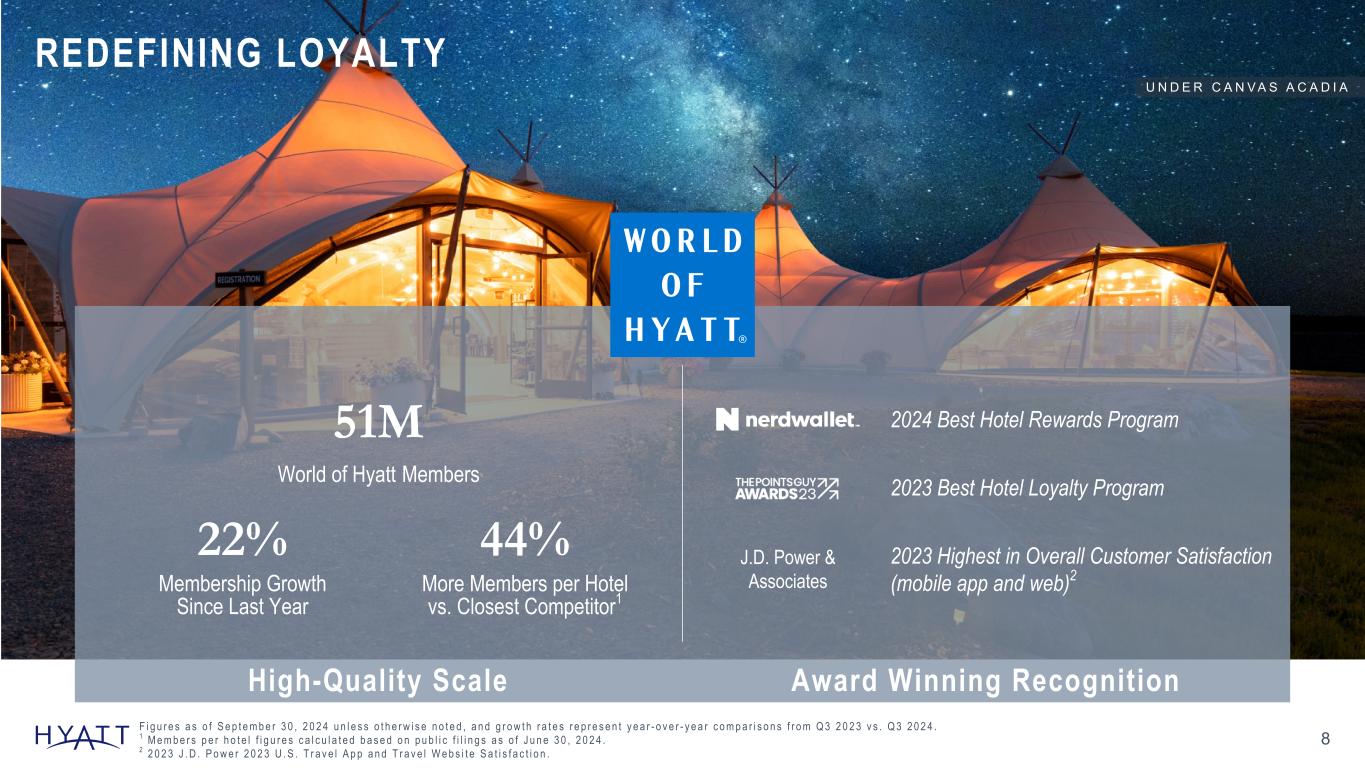 7 B R U N F E L S H O T E L , T H E U N B O U N D C O L L E C T I O N B Y H Y A T T GLOBAL HOSPITALITY COMPANY FOCUSED ON SERVING THE HIGH-END TRAVELER 79 Countr ies Around the World and 6 Cont inents 326,845 Rooms 29 Global Brands 1,363 Hotels and Al l - Inclusive Propert ies F i g u r e s a s o f S e p t e m b e r 3 0 , 2 0 2 4 . 1 S o u r c e : S T R G l o b a l C e n s u s a s o f S e p t e m b e r 3 0 , 2 0 2 4 . L u x u r y B r a n d e d R o o m s a s d e f i n e d b y S T R C h a i n S c a l e C l a s s i f i c a t i o n . #1 World’s Largest Port fo l io of Luxury Branded Rooms in Resort Locat ions 1 ~135,000 Rooms in Pipel ine A Company Record Source Notes: Slide Updated Quarterly Countries, Rooms, Hotel count, and Pipeline linked to ER Body and Consolidations workbook. Manually update Global brands based on Brand Bar and Ranking of Luxury branded rooms in Resort Locations. -Luxury branded rooms in Resort Locations based on STR census as of X, 2024