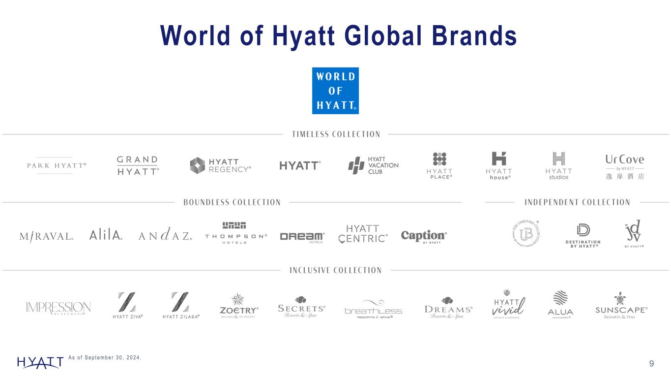 REDEFINING LOYALTY Award Winning Recognition 8 2023 Best Hotel Loyalty Program 2023 Highest in Overall Customer Satisfaction (mobile app and web)2 2024 Best Hotel Rewards Program51M World of Hyatt Members Hilton Marriott IHG Accor High-Quality Scale F i g u r e s a s o f S e p t e m b e r 3 0 , 2 0 2 4 u n l e s s o t h e r w i s e n o t e d , a n d g r o w t h r a t e s r e p r e s e n t y e a r - o v e r - y e a r c o m p a r i s o n s f r o m Q 3 2 0 2 3 v s . Q 3 2 0 2 4 . 1 M e m b e r s p e r h o t e l f i g u r e s c a l c u l a t e d b a s e d o n p u b l i c f i l i n g s a s o f J u n e 3 0 , 2 0 2 4 . 2 2 0 2 3 J . D . P o w e r 2 0 2 3 U . S . T r a v e l A p p a n d T r a v e l W e b s i t e S a t i s f a c t i o n . 44% More Members per Hotel vs. Closest Competitor1 22% Membership Growth Since Last Year U N D E R C A N V A S A C A D I A Source Notes: Updated semi-annually based on filings for IHG, MAR, and HLT At June 30: – H: ~36K members per hotel – HLT: ~25K members per hotel – MAR: ~23K members per hotel – IHG: ~20K members per hotel J.D. Power & Associates