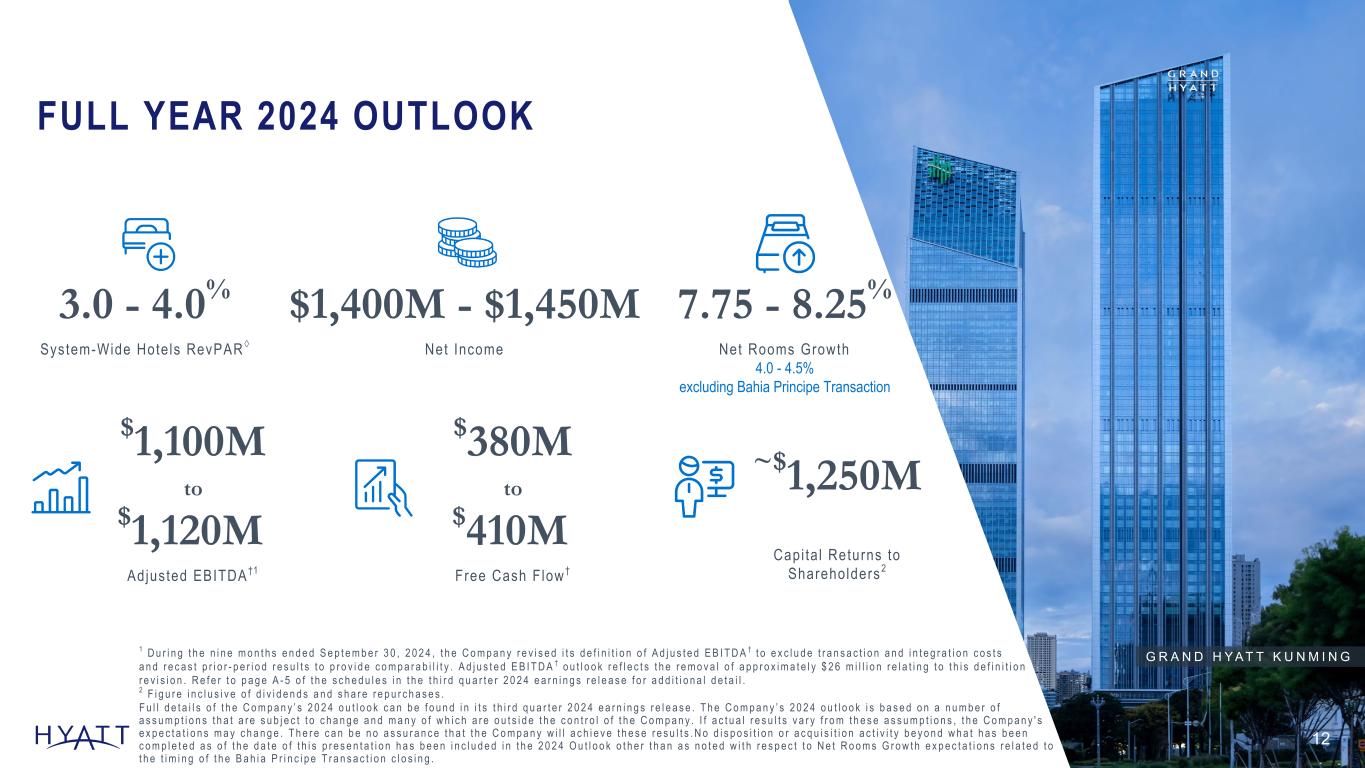 ADJUSTED EBITDA† DILUTED EPS GROSS FEES $471M NET INCOME $4.63 $275M $268M OPERATIONAL RESULTSFINANCIAL RESULTS +10% INCREASE OF ROOMS IN P IPEL INE ~ 1 3 5 , 0 0 0 | A N E W R E C O R D +4.3% NET ROOMS GROWTH +3.0% SYSTEM-WIDE HOTELS REVPAR ◊ +22% WORLD OF HYATT MEMBER GROWTH 5 1 M | A N E W R E C O R D Source Notes: Operational Results: RevPAR and NRG are linked to ER. Pipeline increase should be calculated vs prior year’s ER (rounded pipeline) vs current year rounded pipeline #. World of Hyatt Member growth: Teams\Hyatt Hotels\CHICO-Team- Corporate FPA - Documents\Hotel FP&A\World of Hyatt Enrollments 11 Q3 2024 HIGHLIGHTS • Sold Hyatt Regency Orlando1, resulting in the completion of Hyatt’s $2.0 billion asset disposition commitment announced in August 2021 realizing $2.6 billion of gross proceeds, net of acquisitions, at a 13.3x multiple over the three-year period • Announced the acquisition of Standard International2 including iconic brands The Standard and Bunkhouse Hotels and adding 22 open hotels with approximately 2,000 rooms to Hyatt’s portfolio • On October 28th, announced plans to enter into a long-term, asset-light strategic joint venture with Grupo Piñero, which, upon closing, will add 23 all-inclusive resorts with over 12,000 rooms to Hyatt’s portfolio F i g u r e s a s o f S e p t e m b e r 3 0 , 2 0 2 4 , a n d g r o w t h r a t e s r e p r e s e n t y e a r - o v e r - y e a r c o m p a r i s o n s f r o m Q 3 2 0 2 3 v s . Q 3 2 0 2 4 . 1 H y a t t R e g e n c y O r l a n d o a n d a n a d j a c e n t u n d e v e l o p e d l a n d p a r c e l s o l d o n A u g u s t 1 6 , 2 0 2 4 . 2 S t a n d a r d I n t e r n a t i o n a l a c q u i s i t i o n w a s a n n o u n c e d o n A u g u s t 2 0 , 2 0 2 4 a n d s u b s e q u e n t l y c l o s e d o n O c t o b e r 1 , 2 0 2 4 . U N D E R C A N V A S L A K E P O W E L L E X C L U S I V E A L L I A N C E A S O F Q 3 2 0 2 4 HIGHLIGHTS