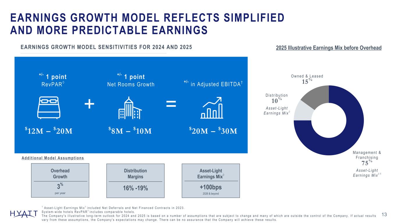 FULL YEAR 2024 OUTLOOK 12 G R A N D H Y A T T K U N M I N G $1,100M to $1,120M  Adjusted EBITDA †1 $380M to $410M  Free Cash Flow † ~$1,250M   Capi ta l Returns to Shareholders 2 1 D u r i n g t h e n i n e m o n t h s e n d e d S e p t e m b e r 3 0 , 2 0 2 4 , t h e C o m p a n y r e v i s e d i t s d e f i n i t i o n o f A d j u s t e d E B I T D A † t o e x c l u d e t r a n s a c t i o n a n d i n t e g r a t i o n c o s t s a n d r e c a s t p r i o r - p e r i o d r e s u l t s t o p r o v i d e c o m p a r a b i l i t y . A d j u s t e d E B I T D A † o u t l o o k r e f l e c t s t h e r e m o v a l o f a p p r o x i m a t e l y $ 2 6 m i l l i o n r e l a t i n g t o t h i s d e f i n i t i o n r e v i s i o n . R e f e r t o p a g e A - 5 o f t h e s c h e d u l e s i n t h e t h i r d q u a r t e r 2 0 2 4 e a r n i n g s r e l e a s e f o r a d d i t i o n a l d e t a i l . 2 F i g u r e i n c l u s i v e o f d i v i d e n d s a n d s h a r e r e p u r c h a s e s . F u l l d e t a i l s o f t h e C o m p a n y ’ s 2 0 2 4 o u t l o o k c a n b e f o u n d i n i t s t h i r d q u a r t e r 2 0 2 4 e a r n i n g s r e l e a s e . T h e C o m p a n y ’ s 2 0 2 4 o u t l o o k i s b a s e d o n a n u m b e r o f a s s u m p t i o n s t h a t a r e s u b j e c t t o c h a n g e a n d m a n y o f w h i c h a r e o u t s i d e t h e c o n t r o l o f t h e C o m p a n y . I f a c t u a l r e s u l t s v a r y f r o m t h e s e a s s u m p t i o n s , t h e C o m p a n y ' s e x p e c t a t i o n s m a y c h a n g e . T h e r e c a n b e n o a s s u r a n c e t h a t t h e C o m p a n y w i l l a c h i e v e t h e s e r e s u l t s . N o d i s p o s i t i o n o r a c q u i s i t i o n a c t i v i t y b e y o n d w h a t h a s b e e n c o m p l e t e d a s o f t h e d a t e o f t h i s p r e s e n t a t i o n h a s b e e n i n c l u d e d i n t h e 2 0 2 4 O u t l o o k o t h e r t h a n a s n o t e d w i t h r e s p e c t t o N e t R o o m s G r o w t h e x p e c t a t i o n s r e l a t e d t o t h e t i m i n g o f t h e B a h i a P r i n c i p e T r a n s a c t i o n c l o s i n g . Source Notes: 3.0 - 4.0% System-Wide Hote ls RevPAR ◊ 1 1 1 $1,400M - $1,450M Net Income 1 1 1 7.75 - 8.25% Net Rooms Growth 4.0 - 4.5% excluding Bahia Principe Transaction