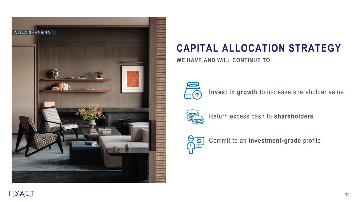 EARNINGS GROWTH MODEL REFLECTS SIMPLIFIED AND MORE PREDICTABLE EARNINGS 13 EARNINGS GROWTH MODEL SENSITIVITIES FOR 2024 AND 2025 +/- 1 point RevPAR◊ +/- in Adjusted EBITDA† $20M – $30M + = Addi t iona l Mode l Assumpt ions 2025 Illustrative Earnings Mix before Overhead Asset-Light Earnings Mix◊ +100bps 2026 & beyond Managemen t & F ranch i s i ng 75% Asse t -L igh t Ea rn ings M ix ◊ 1 Dis t r i bu t i on 10% Asse t -L igh t Ea rn ings M ix ◊ Owned & Leased 15% +/- 1 point Net Rooms Growth $12M – $20M $8M – $10M Distribution Margins Overhead Growth 3% per year 1 A s s e t - L i g h t E a r n i n g s M i x ◊ i n c l u d e d N e t D e f e r r a l s a n d N e t F i n a n c e d C o n t r a c t s i n 2 0 2 3 . S y s t e m - w i d e h o t e l s R e v P A R ◊ i n c l u d e s c o m p a r a b l e h o t e l s . T h e C o m p a n y ' s i l l u s t r a t i v e l o n g - t e r m o u t l o o k f o r 2 0 2 4 a n d 2 0 2 5 i s b a s e d o n a n u m b e r o f a s s u m p t i o n s t h a t a r e s u b j e c t t o c h a n g e a n d m a n y o f w h i c h a r e o u t s i d e t h e c o n t r o l o f t h e C o m p a n y . I f a c t u a l r e s u l t s v a r y f r o m t h e s e a s s u m p t i o n s , t h e C o m p a n y ' s e x p e c t a t i o n s m a y c h a n g e . T h e r e c a n b e n o a s s u r a n c e t h a t t h e C o m p a n y w i l l a c h i e v e t h e s e r e s u l t s . 16% -19% Source Notes: