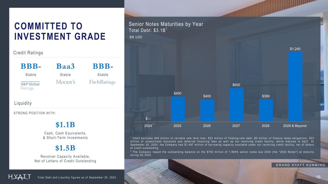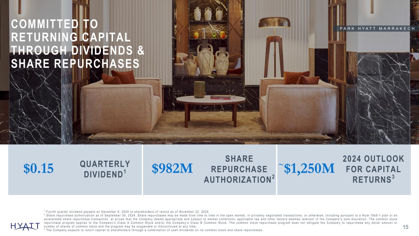$0.15 QUARTERLY DIVIDEND1 $982M SHARE REPURCHASE AUTHORIZATION2 ~$1,250M 2024 OUTLOOK FOR CAPITAL RETURNS3 COMMITTED TO RETURNING CAPITAL THROUGH DIVIDENDS & SHARE REPURCHASES   15 P A R K H Y A T T M A R R A K E C H 1 F o u r t h q u a r t e r d i v i d e n d p a y a b l e o n D e c e m b e r 6 , 2 0 2 4 t o s h a r e h o l d e r s o f r e c o r d a s o f N o v e m b e r 2 2 , 2 0 2 4 . 2 S h a r e r e p u r c h a s e a u t h o r i z a t i o n a s o f S e p t e m b e r 3 0 , 2 0 2 4 . S h a r e r e p u r c h a s e s m a y b e m a d e f r o m t i m e t o t i m e i n t h e o p e n m a r k e t , i n p r i v a t e l y n e g o t i a t e d t r a n s a c t i o n s , o r o t h e r w i s e , i n c l u d i n g p u r s u a n t t o a R u l e 1 0 b 5 - 1 p l a n o r a n a c c e l e r a t e d s h a r e r e p u r c h a s e t r a n s a c t i o n , a t p r i c e s t h a t t h e C o m p a n y d e e m s a p p r o p r i a t e a n d s u b j e c t t o m a r k e t c o n d i t i o n s , a p p l i c a b l e l a w a n d o t h e r f a c t o r s d e e m e d r e l e v a n t i n t h e C o m p a n y ’ s s o l e d i s c r e t i o n . T h e c o m m o n s t o c k r e p u r c h a s e p r o g r a m a p p l i e s t o t h e C o m p a n y ’ s C l a s s A C o m m o n S t o c k a n d / o r t h e C o m p a n y ’ s C l a s s B C o m m o n S t o c k . T h e c o m m o n s t o c k r e p u r c h a s e p r o g r a m d o e s n o t o b l i g a t e t h e C o m p a n y t o r e p u r c h a s e a n y d o l l a r a m o u n t o r n u m b e r o f s h a r e s o f c o m m o n s t o c k a n d t h e p r o g r a m m a y b e s u s p e n d e d o r d i s c o n t i n u e d a t a n y t i m e . 3 T h e C o m p a n y e x p e c t s t o r e t u r n c a p i t a l t o s h a r e h o l d e r s t h r o u g h a c o m b i n a t i o n o f c a s h d i v i d e n d s o n i t s c o m m o n s t o c k a n d s h a r e r e p u r c h a s e s . Source Notes: