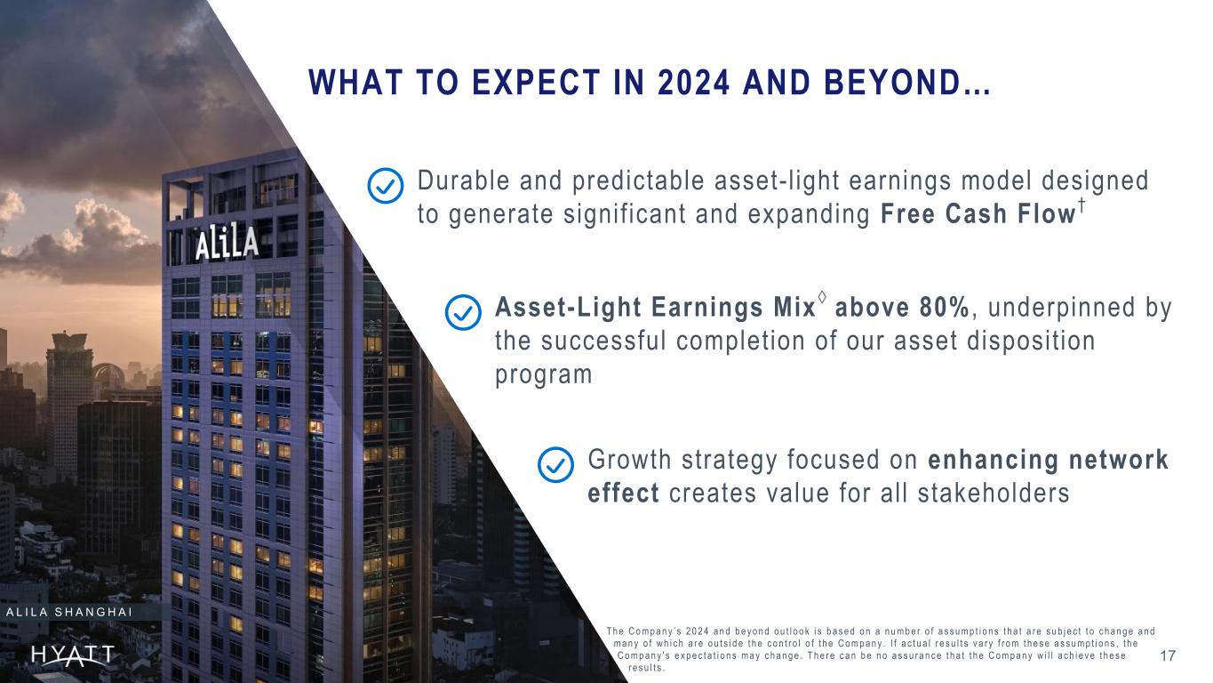 WHAT TO EXPECT IN 2024 AND BEYOND… A L I L A S H A N G H A I Growth strategy focused on enhancing network effect creates value for al l stakeholders Durable and predictable asset- l ight earnings model designed to generate signif icant and expanding Free Cash Flow† Asset-Light Earnings Mix◊ above 80% , underpinned by the successful completion of our asset disposit ion program 17 T h e C o m p a n y ’ s 2 0 2 4 a n d b e y o n d o u t l o o k i s b a s e d o n a n u m b e r o f a s s u m p t i o n s t h a t a r e s u b j e c t t o c h a n g e a n d m a n y o f w h i c h a r e o u t s i d e t h e c o n t r o l o f t h e C o m p a n y . I f a c t u a l r e s u l t s v a r y f r o m t h e s e a s s u m p t i o n s , t h e C o m p a n y ' s e x p e c t a t i o n s m a y c h a n g e . T h e r e c a n b e n o a s s u r a n c e t h a t t h e C o m p a n y w i l l a c h i e v e t h e s e r e s u l t s .
