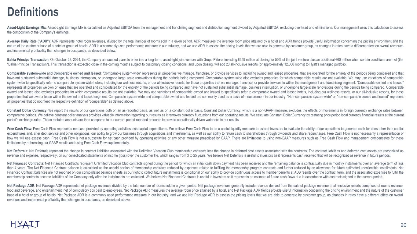 20 Definitions Asset-Light Earnings Mix: Asset-Light Earnings Mix is calculated as Adjusted EBITDA from the management and franchising segment and distribution segment divided by Adjusted EBITDA, excluding overhead and eliminations. Our management uses this calculation to assess the composition of the Company's earnings. Average Daily Rate ("ADR"): ADR represents hotel room revenues, divided by the total number of rooms sold in a given period. ADR measures the average room price attained by a hotel and ADR trends provide useful information concerning the pricing environment and the nature of the customer base of a hotel or group of hotels. ADR is a commonly used performance measure in our industry, and we use ADR to assess the pricing levels that we are able to generate by customer group, as changes in rates have a different effect on overall revenues and incremental profitability than changes in occupancy, as described below. Bahia Principe Transaction: On October 28, 2024, the Company announced plans to enter into a long-term, asset-light joint venture with Grupo Piñero, investing €359 million at closing for 50% of the joint venture plus an additional €60 million when certain conditions are met (the "Bahia Principe Transaction"). This transaction is expected close in the coming months subject to customary closing conditions, and upon closing, will add 23 all-inclusive resorts (or approximately 12,000 rooms) to Hyatt's managed portfolio. Comparable system-wide and Comparable owned and leased: "Comparable system-wide" represents all properties we manage, franchise, or provide services to, including owned and leased properties, that are operated for the entirety of the periods being compared and that have not sustained substantial damage, business interruption, or undergone large scale renovations during the periods being compared. Comparable system-wide also excludes properties for which comparable results are not available. We may use variations of comparable system-wide to specifically refer to comparable system-wide hotels, including our wellness resorts, or our all-inclusive resorts, for those properties that we manage, franchise, or provide services to within the management and franchising segment. "Comparable owned and leased" represents all properties we own or lease that are operated and consolidated for the entirety of the periods being compared and have not sustained substantial damage, business interruption, or undergone large-scale renovations during the periods being compared. Comparable owned and leased also excludes properties for which comparable results are not available. We may use variations of comparable owned and leased to specifically refer to comparable owned and leased hotels, including our wellness resorts, or our all-inclusive resorts, for those properties that we own or lease within the owned and leased segment. Comparable system-wide and comparable owned and leased are commonly used as a basis of measurement in our industry. "Non-comparable system-wide" or "non-comparable owned and leased" represent all properties that do not meet the respective definition of "comparable" as defined above. Constant Dollar Currency: We report the results of our operations both on an as-reported basis, as well as on a constant dollar basis. Constant Dollar Currency, which is a non-GAAP measure, excludes the effects of movements in foreign currency exchange rates between comparative periods. We believe constant dollar analysis provides valuable information regarding our results as it removes currency fluctuations from our operating results. We calculate Constant Dollar Currency by restating prior-period local currency financial results at the current period's exchange rates. These restated amounts are then compared to our current period reported amounts to provide operationally driven variances in our results. Free Cash Flow: Free Cash Flow represents net cash provided by operating activities less capital expenditures. We believe Free Cash Flow to be a useful liquidity measure to us and investors to evaluate the ability of our operations to generate cash for uses other than capital expenditures and, after debt service and other obligations, our ability to grow our business through acquisitions and investments, as well as our ability to return cash to shareholders through dividends and share repurchases. Free Cash Flow is not necessarily a representation of how we will use excess cash. Free Cash Flow is not a substitute for net cash provided by operating activities or any other measure prescribed by GAAP. There are limitations to using non-GAAP measures such as Free Cash Flow and management compensates for these limitations by referencing our GAAP results and using Free Cash Flow supplementally. Net Deferrals: Net Deferrals represent the change in contract liabilities associated with the Unlimited Vacation Club membership contracts less the change in deferred cost assets associated with the contracts. The contract liabilities and deferred cost assets are recognized as revenue and expense, respectively, on our consolidated statements of income (loss) over the customer life, which ranges from 3 to 25 years. We believe Net Deferrals is useful to investors as it represents cash received that will be recognized as revenue in future periods. Net Financed Contracts: Net Financed Contracts represent Unlimited Vacation Club contracts signed during the period for which an initial cash down payment has been received and the remaining balance is contractually due in monthly installments over an average term of less than 4 years. The Net Financed Contract balance is calculated as the unpaid portion of membership contracts reduced by expenses related to fulfilling the membership program contracts and further reduced by an allowance for future estimated uncollectible installments. Net Financed Contract balances are not reported on our consolidated balance sheets as our right to collect futu