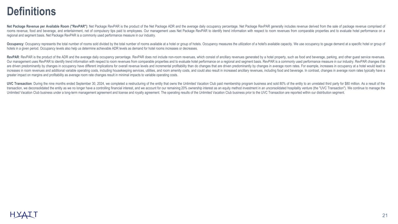21 Definitions Net Package Revenue per Available Room ("RevPAR"): Net Package RevPAR is the product of the Net Package ADR and the average daily occupancy percentage. Net Package RevPAR generally includes revenue derived from the sale of package revenue comprised of rooms revenue, food and beverage, and entertainment, net of compulsory tips paid to employees. Our management uses Net Package RevPAR to identify trend information with respect to room revenues from comparable properties and to evaluate hotel performance on a regional and segment basis. Net Package RevPAR is a commonly used performance measure in our industry. Occupancy: Occupancy represents the total number of rooms sold divided by the total number of rooms available at a hotel or group of hotels. Occupancy measures the utilization of a hotel's available capacity. We use occupancy to gauge demand at a specific hotel or group of hotels in a given period. Occupancy levels also help us determine achievable ADR levels as demand for hotel rooms increases or decreases. RevPAR: RevPAR is the product of the ADR and the average daily occupancy percentage. RevPAR does not include non-room revenues, which consist of ancillary revenues generated by a hotel property, such as food and beverage, parking, and other guest service revenues. Our management uses RevPAR to identify trend information with respect to room revenues from comparable properties and to evaluate hotel performance on a regional and segment basis. RevPAR is a commonly used performance measure in our industry. RevPAR changes that are driven predominantly by changes in occupancy have different implications for overall revenue levels and incremental profitability than do changes that are driven predominantly by changes in average room rates. For example, increases in occupancy at a hotel would lead to increases in room revenues and additional variable operating costs, including housekeeping services, utilities, and room amenity costs, and could also result in increased ancillary revenues, including food and beverage. In contrast, changes in average room rates typically have a greater impact on margins and profitability as average room rate changes result in minimal impacts to variable operating costs. UVC Transaction: During the nine months ended September 30, 2024, we completed a restructuring of the entity that owns the Unlimited Vacation Club paid membership program business and sold 80% of the entity to an unrelated third party for $80 million. As a result of the transaction, we deconsolidated the entity as we no longer have a controlling financial interest, and we account for our remaining 20% ownership interest as an equity method investment in an unconsolidated hospitality venture (the "UVC Transaction"). We continue to manage the Unlimited Vacation Club business under a long-term management agreement and license and royalty agreement. The operating results of the Unlimited Vacation Club business prior to the UVC Transaction are reported within our distribution segment.