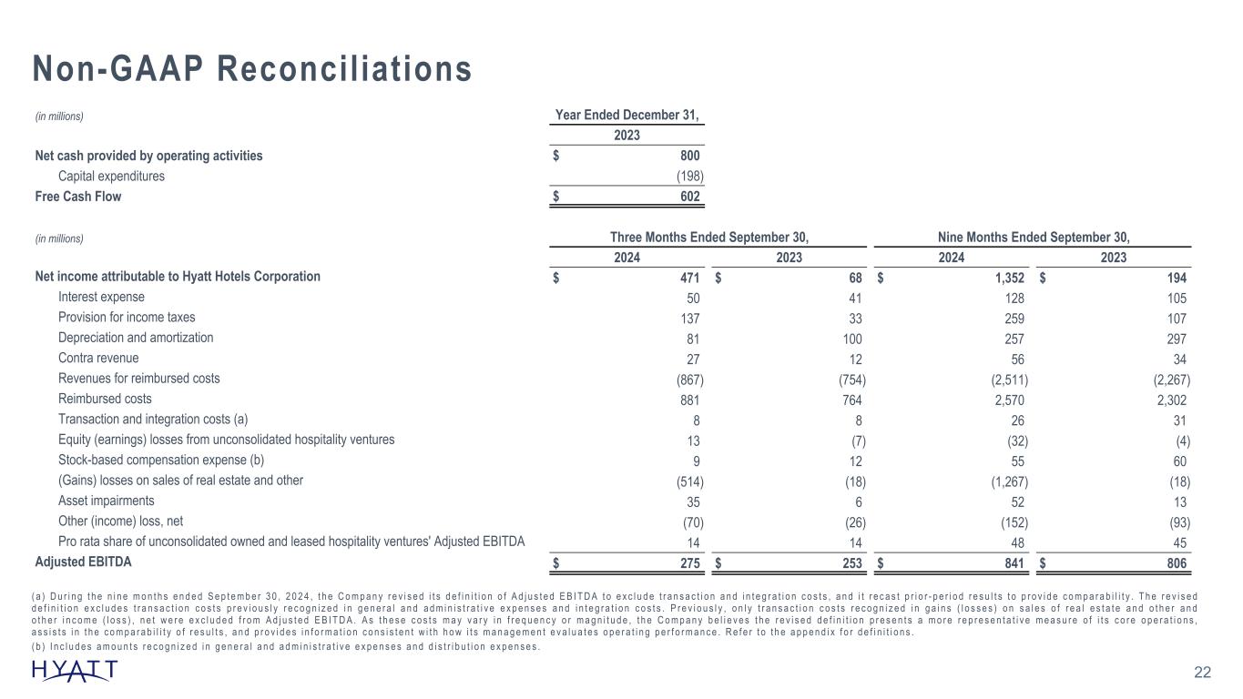 Non-GAAP Reconciliations 22 (in millions) Year Ended December 31, 2023 Net cash provided by operating activities $ 800 Capital expenditures (198) Free Cash Flow $ 602 (in millions) Three Months Ended September 30, Nine Months Ended September 30, 2024 2023 2024 2023 Net income attributable to Hyatt Hotels Corporation $ 471 $ 68 $ 1,352 $ 194 Interest expense 50 41 128 105 Provision for income taxes 137 33 259 107 Depreciation and amortization 81 100 257 297 Contra revenue 27 12 56 34 Revenues for reimbursed costs (867) (754) (2,511) (2,267) Reimbursed costs 881 764 2,570 2,302 Transaction and integration costs (a) 8 8 26 31 Equity (earnings) losses from unconsolidated hospitality ventures 13 (7) (32) (4) Stock-based compensation expense (b) 9 12 55 60 (Gains) losses on sales of real estate and other (514) (18) (1,267) (18) Asset impairments 35 6 52 13 Other (income) loss, net (70) (26) (152) (93) Pro rata share of unconsolidated owned and leased hospitality ventures' Adjusted EBITDA 14 14 48 45 Adjusted EBITDA $ 275 $ 253 $ 841 $ 806 Source Notes: linked to ER schedule ( a ) D u r i n g t h e n i n e m o n t h s e n d e d S e p t e m b e r 3 0 , 2 0 2 4 , t h e C o m p a n y r e v i s e d i t s d e f i n i t i o n o f A d j u s t e d E B I T D A t o e x c l u d e t r a n s a c t i o n a n d i n t e g r a t i o n c o s t s , a n d i t r e c a s t p r i o r - p e r i o d r e s u l t s t o p r o v i d e c o m p a r a b i l i t y . T h e r e v i s e d d e f i n i t i o n e x c l u d e s t r a n s a c t i o n c o s t s p r e v i o u s l y r e c o g n i z e d i n g e n e r a l a n d a d m i n i s t r a t i v e e x p e n s e s a n d i n t e g r a t i o n c o s t s . P r e v i o u s l y , o n l y t r a n s a c t i o n c o s t s r e c o g n i z e d i n g a i n s ( l o s s e s ) o n s a l e s o f r e a l e s t a t e a n d o t h e r a n d o t h e r i n c o m e ( l o s s ) , n e t w e r e e x c l u d e d f r o m A d j u s t e d E B I T D A . A s t h e s e c o s t s m a y v a r y i n f r e q u e n c y o r m a g n i t u d e , t h e C o m p a n y b e l i e v e s t h e r e v i s e d d e f i n i t i o n p r e s e n t s a m o r e r e p r e s e n t a t i v e m e a s u r e o f i t s c o r e o p e r a t i o n s , a s s i s t s i n t h e c o m p a r a b i l i t y o f r e s u l t s , a n d p r o v i d e s i n f o r m a t i o n c o n s i s t e n t w i t h h o w i t s m a n a g e m e n t e v a l u a t e s o p e r a t i n g p e r f o r m a n c e . R e f e r t o t h e a p p e n d i x f o r d e f i n i t i o n s . ( b ) I n c l u d e s a m o u n t s r e c o g n i z e d i n g e n e r a l a n d a d m i n i s t r a t i v e e x p e n s e s a n d d i s t r i b u t i o n e x p e n s e s .