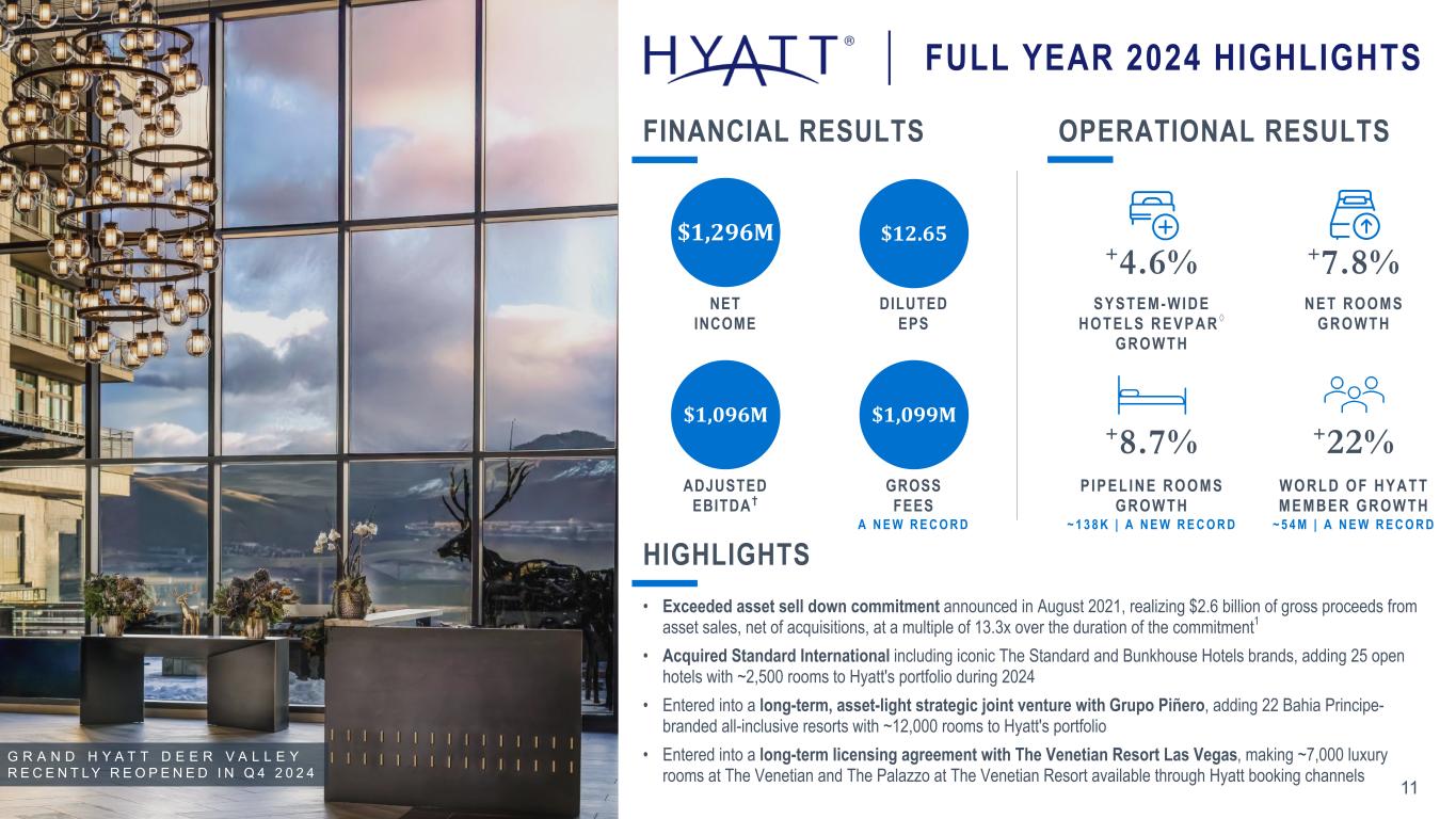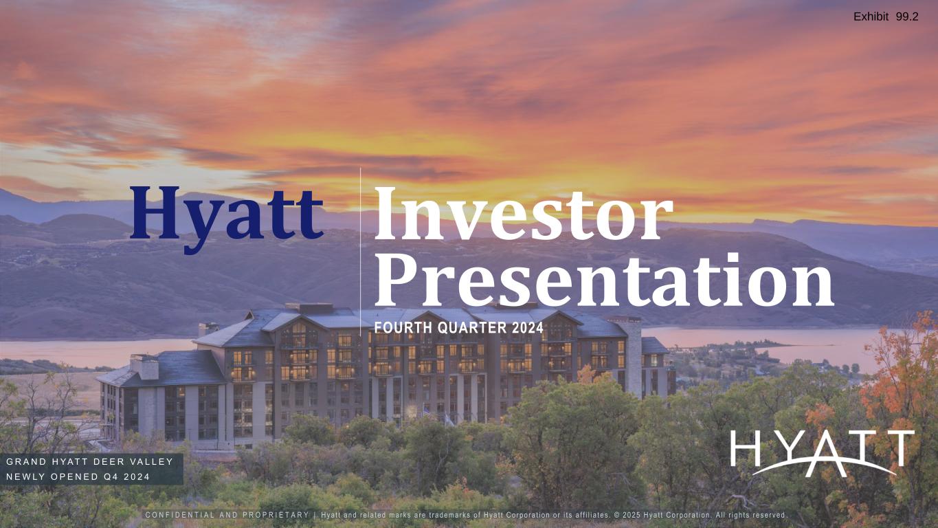 C O N F I D E N T I A L A N D P R O P R I E T A R Y | H y a t t a n d r e l a t e d m a r k s a r e t r a d e m a r k s o f H y a t t C o r p o r a t i o n o r i t s a f f i l i a t e s . © 2 0 2 5 H y a t t C o r p o r a t i o n . A l l r i g h t s r e s e r v e d . Investor Presentation Hyatt FOURTH QUARTER 2024 G R A N D H Y A T T D E E R V A L L E Y N E W L Y O P E N E D Q 4 2 0 2 4