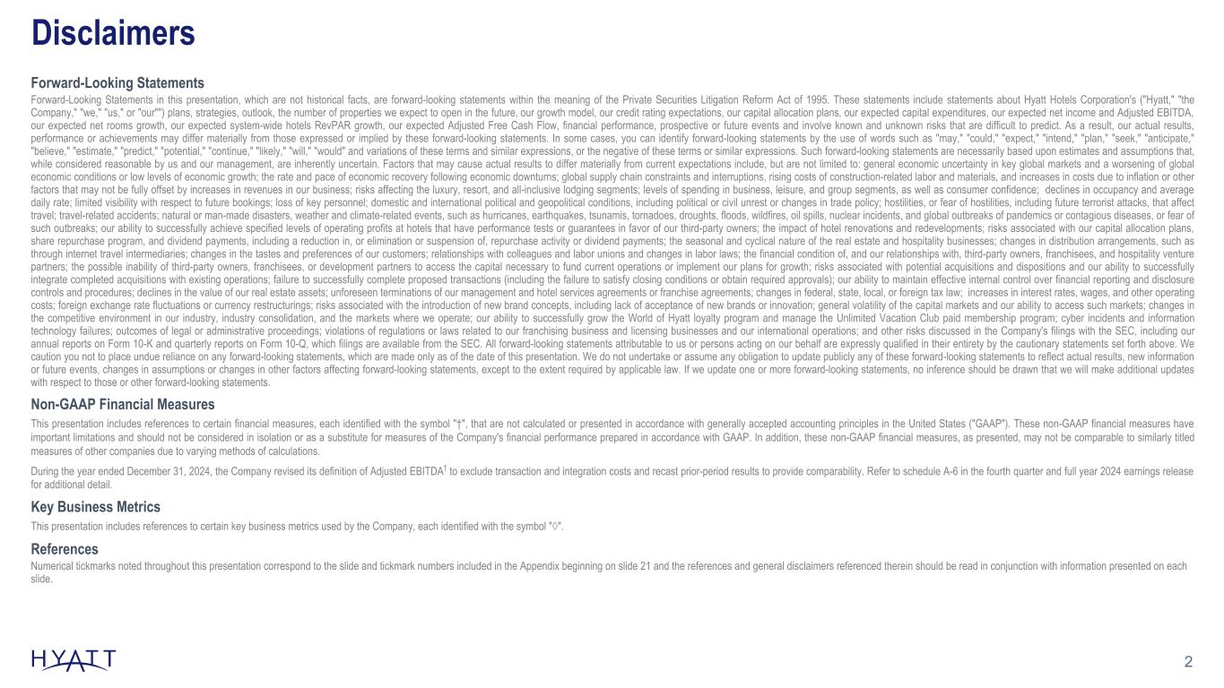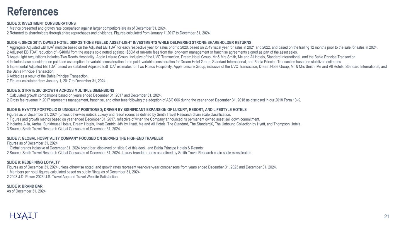 21 References SLIDE 3: INVESTMENT CONSIDERATIONS 1 Metrics presented and growth rate comparison against larger competitors are as of December 31, 2024. 2 Returned to shareholders through share repurchases and dividends. Figures calculated from January 1, 2017 to December 31, 2024. SLIDE 4: SINCE 2017: OWNED HOTEL DISPOSITIONS FUELED ASSET-LIGHT INVESTMENTS WHILE DELIVERING STRONG SHAREHOLDER RETURNS 1 Aggregate Adjusted EBITDA† multiple based on the Adjusted EBITDA† for each respective year for sales prior to 2020, based on 2019 fiscal year for sales in 2021 and 2022, and based on the trailing 12 months prior to the sale for sales in 2024. 2 Adjusted EBITDA† reduction of ~$400M from the assets sold netted against ~$50M of run-rate fees from the long-term management or franchise agreements signed as part of the asset sales. 3 Asset-Light Acquisitions includes Two Roads Hospitality, Apple Leisure Group, inclusive of the UVC Transaction, Dream Hotel Group, Mr & Mrs Smith, Me and All Hotels, Standard International, and the Bahia Principe Transaction. 4 Includes base consideration paid and assumption for variable consideration to be paid; variable consideration for Dream Hotel Group, Standard International, and Bahia Principe Transaction based on stabilized estimates. 5 Incremental Adjusted EBITDA† based on stabilized Adjusted EBITDA† estimates for Two Roads Hospitality, Apple Leisure Group, inclusive of the UVC Transaction, Dream Hotel Group, Mr & Mrs Smith, Me and All Hotels, Standard International, and the Bahia Principe Transaction. 6 Added as a result of the Bahia Principe Transaction. 7 Figures calculated from January 1, 2017 to December 31, 2024. SLIDE 5: STRATEGIC GROWTH ACROSS MULTIPLE DIMENSIONS 1 Calculated growth comparisons based on years ended December 31, 2017 and December 31, 2024. 2 Gross fee revenue in 2017 represents management, franchise, and other fees following the adoption of ASC 606 during the year ended December 31, 2018 as disclosed in our 2018 Form 10-K. SLIDE 6: HYATT'S PORTFOLIO IS UNIQUELY POSITIONED; DRIVEN BY SIGNIFICANT EXPANSION OF LUXURY, RESORT, AND LIFESTYLE HOTELS Figures as of December 31, 2024 (unless otherwise noted). Luxury and resort rooms as defined by Smith Travel Research chain scale classification. 1 Figures and growth metrics based on year ended December 31, 2017, reflective of when the Company announced its permanent owned asset sell down commitment. 2 Includes Alila, Andaz, Bunkhouse Hotels, Dream Hotels, Hyatt Centric, JdV by Hyatt, Me and All Hotels, The Standard, The StandardX, The Unbound Collection by Hyatt, and Thompson Hotels. 3 Source: Smith Travel Research Global Census as of December 31, 2024. SLIDE 7: GLOBAL HOSPITALITY COMPANY FOCUSED ON SERVING THE HIGH-END TRAVELER Figures as of December 31, 2024. 1 Global brands inclusive of December 31, 2024 brand bar, displayed on slide 9 of this deck, and Bahia Principe Hotels & Resorts. 2 Source: Smith Travel Research Global Census as of December 31, 2024. Luxury branded rooms as defined by Smith Travel Research chain scale classification. SLIDE 8: REDEFINING LOYALTY Figures as of December 31, 2024 unless otherwise noted, and growth rates represent year-over-year comparisons from years ended December 31, 2023 and December 31, 2024. 1 Members per hotel figures calculated based on public filings as of December 31, 2024. 2 2023 J.D. Power 2023 U.S. Travel App and Travel Website Satisfaction. SLIDE 9: BRAND BAR As of December 31, 2024.