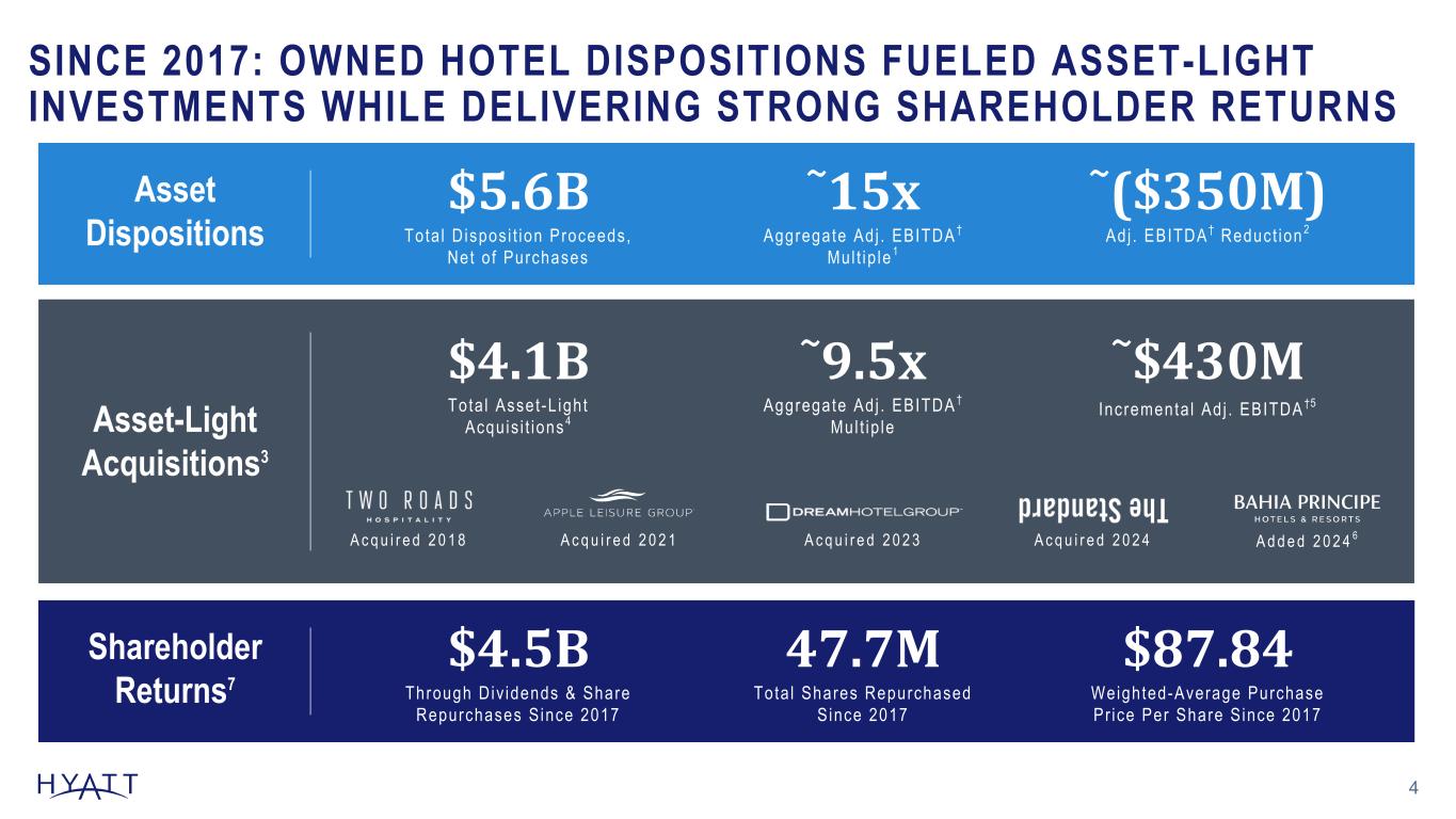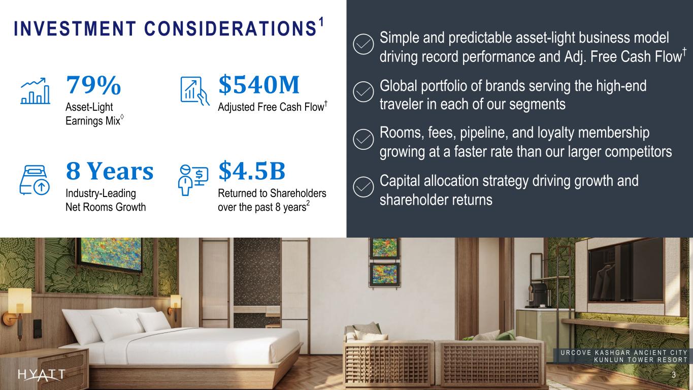 Disclaimers 2 Forward-Looking Statements Forward-Looking Statements in this presentation, which are not historical facts, are forward-looking statements within the meaning of the Private Securities Litigation Reform Act of 1995. These statements include statements about Hyatt Hotels Corporation's ("Hyatt," "the Company," "we," "us," or "our"") plans, strategies, outlook, the number of properties we expect to open in the future, our growth model, our credit rating expectations, our capital allocation plans, our expected capital expenditures, our expected net income and Adjusted EBITDA, our expected net rooms growth, our expected system-wide hotels RevPAR growth, our expected Adjusted Free Cash Flow, financial performance, prospective or future events and involve known and unknown risks that are difficult to predict. As a result, our actual results, performance or achievements may differ materially from those expressed or implied by these forward-looking statements. In some cases, you can identify forward-looking statements by the use of words such as "may," "could," "expect," "intend," "plan," "seek," "anticipate," "believe," "estimate," "predict," "potential," "continue," "likely," "will," "would" and variations of these terms and similar expressions, or the negative of these terms or similar expressions. Such forward-looking statements are necessarily based upon estimates and assumptions that, while considered reasonable by us and our management, are inherently uncertain. Factors that may cause actual results to differ materially from current expectations include, but are not limited to: general economic uncertainty in key global markets and a worsening of global economic conditions or low levels of economic growth; the rate and pace of economic recovery following economic downturns; global supply chain constraints and interruptions, rising costs of construction-related labor and materials, and increases in costs due to inflation or other factors that may not be fully offset by increases in revenues in our business; risks affecting the luxury, resort, and all-inclusive lodging segments; levels of spending in business, leisure, and group segments, as well as consumer confidence; declines in occupancy and average daily rate; limited visibility with respect to future bookings; loss of key personnel; domestic and international political and geopolitical conditions, including political or civil unrest or changes in trade policy; hostilities, or fear of hostilities, including future terrorist attacks, that affect travel; travel-related accidents; natural or man-made disasters, weather and climate-related events, such as hurricanes, earthquakes, tsunamis, tornadoes, droughts, floods, wildfires, oil spills, nuclear incidents, and global outbreaks of pandemics or contagious diseases, or fear of such outbreaks; our ability to successfully achieve specified levels of operating profits at hotels that have performance tests or guarantees in favor of our third-party owners; the impact of hotel renovations and redevelopments; risks associated with our capital allocation plans, share repurchase program, and dividend payments, including a reduction in, or elimination or suspension of, repurchase activity or dividend payments; the seasonal and cyclical nature of the real estate and hospitality businesses; changes in distribution arrangements, such as through internet travel intermediaries; changes in the tastes and preferences of our customers; relationships with colleagues and labor unions and changes in labor laws; the financial condition of, and our relationships with, third-party owners, franchisees, and hospitality venture partners; the possible inability of third-party owners, franchisees, or development partners to access the capital necessary to fund current operations or implement our plans for growth; risks associated with potential acquisitions and dispositions and our ability to successfully integrate completed acquisitions with existing operations; failure to successfully complete proposed transactions (including the failure to satisfy closing conditions or obtain required approvals); our ability to maintain effective internal control over financial reporting and disclosure controls and procedures; declines in the value of our real estate assets; unforeseen terminations of our management and hotel services agreements or franchise agreements; changes in federal, state, local, or foreign tax law; increases in interest rates, wages, and other operating costs; foreign exchange rate fluctuations or currency restructurings; risks associated with the introduction of new brand concepts, including lack of acceptance of new brands or innovation; general volatility of the capital markets and our ability to access such markets; changes in the competitive environment in our industry, industry consolidation, and the markets where we operate; our ability to successfully grow the World of Hyatt loyalty program and manage the Unlimited Vacation Club paid membership program; cyber incidents and information technology failures; outcomes of legal or administrative proceedings; violations of regulations or laws related to our franchising business and licensing businesses and our international operations; and other risks discussed in the Company's filings with the SEC, including our annual reports on Form 10-K and quarterly reports on Form 10-Q, which filings are available from the SEC. All forward-looking statements attributable to us or persons acting on our behalf are expressly qualified in their entirety by the cautionary statements set forth above. We caution you not to place undue reliance on any forward-looking statements, which are made only as of the date of this presentation. We do not undertake or assume any obligation to update publicly any of these forward-looking statements to reflect actual results, new information or future events, changes in assumptions or changes in other factors affecting forwa