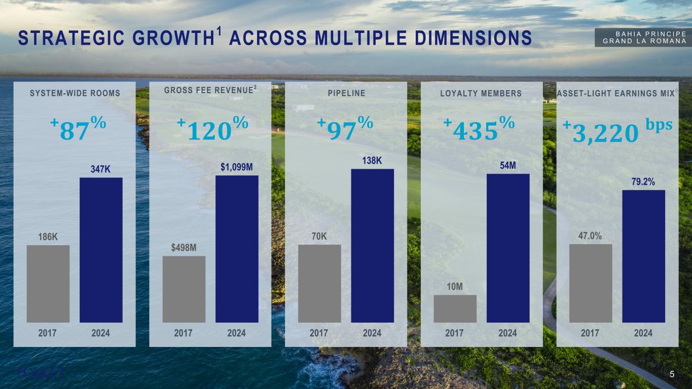 4 A c q u i r e d 2 0 1 8 A c q u i r e d 2 0 2 1 A c q u i r e d 2 0 2 3 A c q u i r e d 2 0 2 4 SINCE 2017: OWNED HOTEL DISPOSITIONS FUELED ASSET-LIGHT INVESTMENTS WHILE DELIVERING STRONG SHAREHOLDER RETURNS $5.6B Tota l D ispos i t ion Proceeds, Net o f Purchases ~15x Aggregate Ad j . EBITDA † Mul t ip le 1 Asset Dispositions ~($350M) Adj . EBITDA † Reduct ion 2 $4.1B Tota l Asset -L ight Acqu is i t ions 4 ~9.5x Aggregate Ad j . EBITDA † Mul t ip leAsset-Light Acquisitions3 ~$430M Incrementa l Ad j . EBITDA †5 $4.5B Through Div idends & Share Repurchases S ince 2017 Shareholder Returns7 47.7M Tota l Shares Repurchased S ince 2017 $87.84 Weighted-Average Purchase Pr ice Per Share S ince 2017 Footnotes: 1 Aggregate Adjusted EBITDA† multiple based on the Adjusted EBITDA† for each respective year for sales prior to 2020, based on 2019 fiscal year for sales in 2021 and 2022, and based on the trailing 12 months prior to the sale for sales in 2024. 2 Adjusted EBITDA† reduction of ~$400M from the assets sold netted against ~$50M of run-rate fees from the long-term management or franchise agreements signed as part of the asset sales. 3 Asset-Light Acquisitions includes Two Roads Hospitality, Apple Leisure Group, inclusive of the UVC Transaction, Dream Hotel Group, Mr & Mrs Smith, Me and All Hotels, Standard International, and the Bahia Principe Transaction. 4 Includes base consideration paid and assumption for variable consideration to be paid; variable consideration for Dream Hotel Group, Standard International, and Bahia Principe Transaction based on stabilized estimates. 5 Incremental Adjusted EBITDA† based on stabilized Adjusted EBITDA† estimates for Two Roads Hospitality, Apple Leisure Group, inclusive of the UVC Transaction, Dream Hotel Group, Mr & Mrs Smith, Me and All Hotels, Standard International, and the Bahia Principe Transaction. 6 Added as a result of the Bahia Principe Transaction. 7 Figures calculated from January 1, 2017 - December 31, 2024. Source Notes: Shareholder Returns $ (div + repurchases): – 2017: 743M – 2018: 1,014M – 2019: 501M – 2020: 89M – 2021: 0 – 2022: 369M – 2023: 492M – 2024: 1,250M Total # Shares Repurchased: – 2017: 12.19M – 2018: 12.72M – 2019: 5.62M – 2020: 0.83M – 2021: 0 – 2022: 4.23M – 2023: 4.12M – 2024: 7.99M CHICO-Team-Corporate FPA - Documents\Fact Pack and QA Document\2024\Investor Consideration Deck Support\Annual A d d e d 2 0 2 4 6