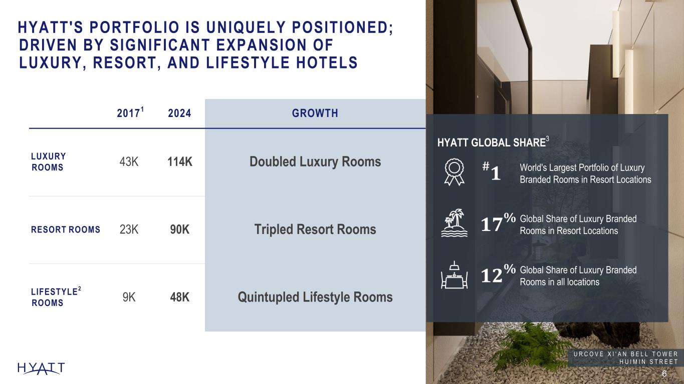 STRATEGIC GROWTH1 ACROSS MULTIPLE DIMENSIONS 5 +87% +120% +97% +435% +3,220 bps SYSTEM-WIDE ROOMS GROSS FEE REVENUE2 PIPELINE LOYALTY MEMBERS ASSET-LIGHT EARNINGS MIX◊  Source Notes: Updated Annually Support: Hyatt Hotels\CHICO-Team-Corporate FPA - Documents\Fact Pack and QA Document\2024\Investor Consideration Deck Support\Annual \ Strategic Growth support file -2009 Data can be found under 2009 folder System-wide rooms based on Inventory as of December 31, 2009 Fee Revenue, pipeline, and loyalty members based on Hyatt 2009 Annual Report -2017 Data can be found under 2017 folder System-wide rooms based on Inventory as of December 31, 2017 Fee Revenue and pipeline based on Q4 2017 Earnings Release Loyalty members based on 10-K 2017 -2023 Data System-wide rooms based on Inventory as of December 31, 2023 Fee Revenue and pipeline based on Q4 2023 Earnings Release Loyalty members based on 10-K 2023 as well as Enrollment and Program member count Q4 2023 Footnotes: 1 Calculated growth comparisons based on years ended December 31, 2017 and December 31, 2024. 2 Gross fee revenue in 2017 represents management, franchise, and other fees following the adoption of ASC 606 during the year ended December 31, 2018 as disclosed in our 2018 Form 10-K. 186K 347K 2017 2024 $498M $1,099M 2017 2024 70K 138K 2017 2024 10M 54M 2017 2024 47.0% 79.2% 2017 2024 B A H I A P R I N C I P E G R A N D L A R O M A N A