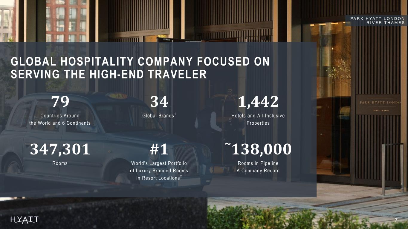 20171 2024 GROWTH LUXURY ROOMS 43K 114K Doubled Luxury Rooms RESORT ROOMS 23K 90K Tripled Resort Rooms LIFESTYLE2 ROOMS 9K 48K Quintupled Lifestyle Rooms HYATT'S PORTFOLIO IS UNIQUELY POSITIONED; DRIVEN BY SIGNIFICANT EXPANSION OF LUXURY, RESORT, AND LIFESTYLE HOTELS  6 HYATT GLOBAL SHARE3 #1 World's Largest Portfolio of Luxury Branded Rooms in Resort Locations 17% Global Share of Luxury Branded Rooms in Resort Locations 12% Global Share of Luxury Branded Rooms in all locations U R C O V E X I ' A N B E L L T O W E R H U I M I N S T R E E T Source Notes: Updated Annually Support: Hyatt Hotels\CHICO-Team-Corporate FPA - Documents\Fact Pack and QA Document\202X\Investor Consideration Deck Support\Annual -Luxury, Lifestyle, and Resort rooms calculated based on HHC Inventory as of Year end and calculated based on Luxury Lifestyle or Resort Support file -Hyatt Global Share calculated based on STR census as of Year-end. Footnotes: Figures as of December 31, 2024 (unless otherwise noted). Luxury and resort rooms as defined by Smith Travel Research chain scale classification. 1 Figures and growth metrics based on year ended December 31, 2017, reflective of when the Company announced its permanent owned asset sell down commitment. 2 Includes Alila, Andaz, Bunkhouse Hotels, Dream Hotels, Hyatt Centric, JdV by Hyatt, Me and All Hotels, The Standard, The StandardX, The Unbound Collection by Hyatt, and Thompson Hotels. 3 Source: Smith Travel Research Global Census as of December 31, 2024.