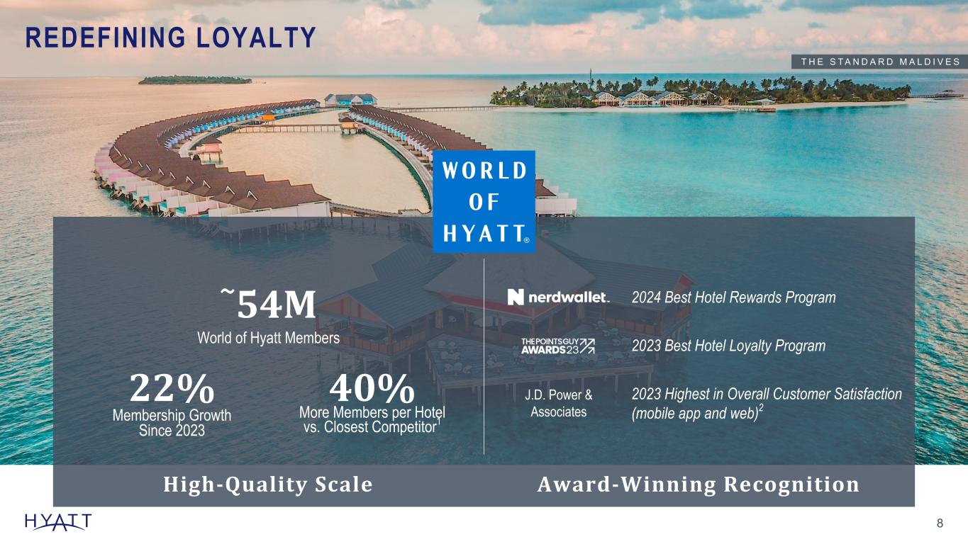 7 GLOBAL HOSPITALITY COMPANY FOCUSED ON SERVING THE HIGH-END TRAVELER 79 Countr ies Around the World and 6 Cont inents 347,301 Rooms 34 Global Brands1 1,442 Hotels and Al l - Inclusive Propert ies #1 World 's Largest Port fo l io of Luxury Branded Rooms in Resort Locat ions 2 ~138,000 Rooms in Pipel ine A Company Record Source Notes: Slide Updated Quarterly Countries, Rooms, Hotel count, and Pipeline linked to ER Body and Consolidations workbook. Manually update Global brands based on Brand Bar and Ranking of Luxury branded rooms in Resort Locations. -Luxury branded rooms in Resort Locations based on STR census as of X, 2024 Colleagues at 12/31/24: 227,000 Footnotes: Figures as of December 31, 2024. 1 Global brands inclusive of December 31, 2024 brand bar, displayed on slide 9 of this deck, and Bahia Principe Hotels & Resorts. 2 Source: Smith Travel Research Global Census as of December 31, 2024. Luxury branded rooms as defined by Smith Travel Research chain scale classification. P A R K H Y A T T L O N D O N R I V E R T H A M E S