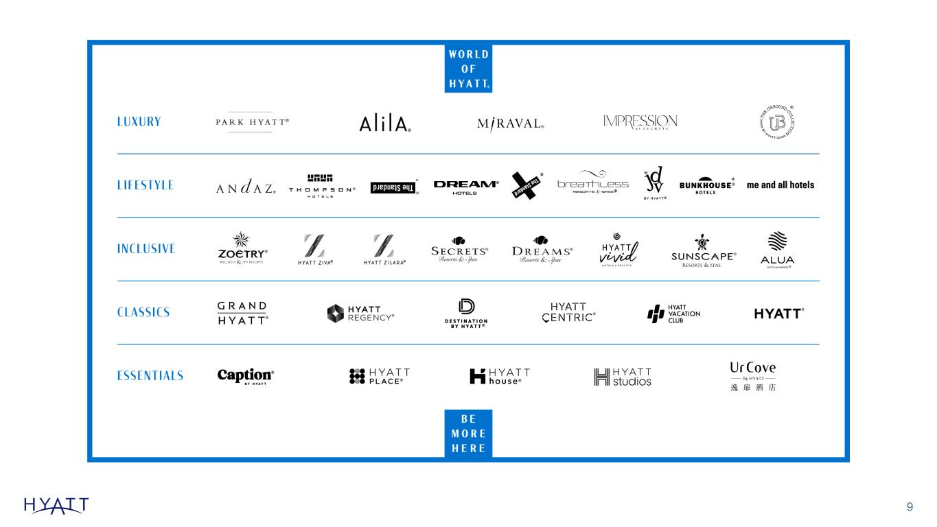 REDEFINING LOYALTY Award-Winning Recognition 8 2023 Best Hotel Loyalty Program 2023 Highest in Overall Customer Satisfaction (mobile app and web)2 2024 Best Hotel Rewards Program~54M World of Hyatt Members Hilton Marriott IHG Accor High-Quality Scale 40% More Members per Hotel vs. Closest Competitor1 22% Membership Growth Since 2023 T H E S T A N D A R D M A L D I V E S Source Notes: Updated semi-annually based on filings for IHG, MAR, and HLT At June 30: – H: ~36K members per hotel – HLT: ~25K members per hotel – MAR: ~23K members per hotel – IHG: ~20K members per hotel At Sept 30: – H: ~37.4K members per hotel (51M members/ 326,845) – HLT: ~26.0K members per hotel – MAR: ~24.4K members per hotel – IHG: ~20.7K members per hotel H 37.4K vs HLT 26.0K = 43.8% World of Hyatt Membership: – YE 2023: 43.8M – YE 2024: 53.5M (YoY Growth 22.1%) J.D. Power & Associates Footnotes: Figures as of December 31, 2024 unless otherwise noted, and growth rates represent year-over-year comparisons from years ended 2023 and 2024. 1 Members per hotel figures calculated based on public filings as of December 31, 2024. 2 2023 J.D. Power 2023 U.S. Travel App and Travel Website Satisfaction.