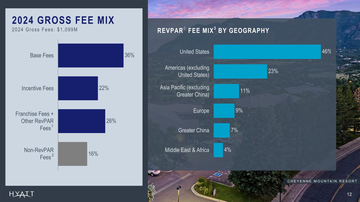 ADJUSTED EBITDA† DILUTED EPS GROSS FEES A N E W R E C O R D $1,296M NET INCOME $12.65 $1,096M $1,099M OPERATIONAL RESULTSFINANCIAL RESULTS +8.7% PIPEL INE ROOMS GROWTH ~ 1 3 8 K | A N E W R E C O R D +7.8% NET ROOMS GROWTH +4.6% SYSTEM-WIDE HOTELS REVPAR ◊ GROWTH +22% WORLD OF HYATT MEMBER GROWTH ~ 5 4 M | A N E W R E C O R D Source Notes: Operational Results: RevPAR and NRG are linked to ER. Pipeline increase should be calculated vs prior year’s ER (rounded pipeline) vs current year rounded pipeline #. World of Hyatt Member growth: Teams\Hyatt Hotels\CHICO-Team- Corporate FPA - Documents\Hotel FP&A\World of Hyatt Enrollments Reported Pipeline: – 2023 YE: 127K – 2024 YE: 138K 11 FULL YEAR 2024 HIGHLIGHTS • Exceeded asset sell down commitment announced in August 2021, realizing $2.6 billion of gross proceeds from asset sales, net of acquisitions, at a multiple of 13.3x over the duration of the commitment1 • Acquired Standard International including iconic The Standard and Bunkhouse Hotels brands, adding 25 open hotels with ~2,500 rooms to Hyatt's portfolio during 2024 • Entered into a long-term, asset-light strategic joint venture with Grupo Piñero, adding 22 Bahia Principe- branded all-inclusive resorts with ~12,000 rooms to Hyatt's portfolio • Entered into a long-term licensing agreement with The Venetian Resort Las Vegas, making ~7,000 luxury rooms at The Venetian and The Palazzo at The Venetian Resort available through Hyatt booking channels HIGHLIGHTS Footnotes: Figures as of December 31, 2024, and growth rates represent year-over-year comparisons from years ended December 31, 2023 and December 31, 2024. 1 Proceeds and multiple reflective from the announcement of the disposition commitment in August 2021 through its completion in August 2024. G R A N D H Y A T T D E E R V A L L E Y R E C E N T L Y R E O P E N E D I N Q 4 2 0 2 4