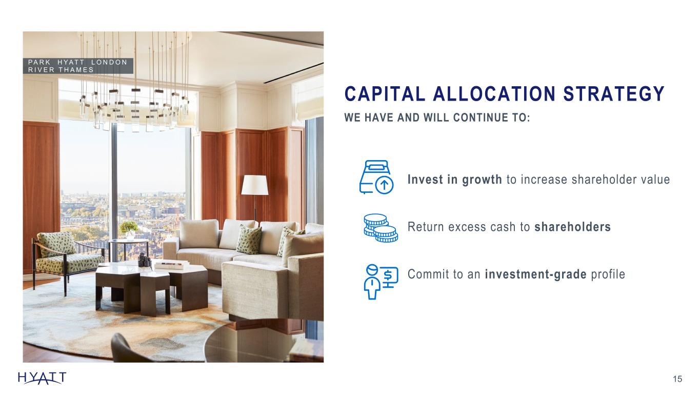 2024 MARKED SUCCESSFUL COMPLETION OF LATEST SELL DOWN COMMITMENT 14 IMPACT OF 2024 ASSET SALES $1.9B Gross Proceeds from 2024 Asset Sales $80M Impact from Assets Sold to 2024 Owned and Leased Segment Adjusted EBITDA† $156M 2023 Adjusted EBITDA† Sold3 Source Notes: Updated quarterly, based on ER schedule Contribution from sold owned and leased hotels1 and sold unconsolidated hospitality ventures2 Footnotes: Additional details relating to the impact of sold hotels on owned and leased segment adjusted EBITDA† can be found on schedule A-9 of the fourth quarter and full year 2024 earnings release. 1 Contribution from sold owned and leased hotels represents the Adjusted EBITDA† contribution in each period for hotels that have been sold as of December 31, 2024 and entered into long-term management or franchise agreements, and excludes fee income retained upon sale. Hotels that have been sold include Hyatt Regency Aruba Resort Spa and Casino (1Q24), Park Hyatt Zurich (2Q24), Hyatt Regency San Antonio Riverwalk (2Q24), Hyatt Regency Green Bay (2Q24), Hyatt Regency Orlando (3Q24), and Hyatt Regency O’Hare Chicago (4Q24). 2 Contribution from sold unconsolidated hospitality ventures represents Hyatt's pro rata share of unconsolidated hospitality ventures' Adjusted EBITDA† contribution in each period for unconsolidated hospitality ventures that have been sold (Park Hyatt Los Cabos at Cabo Del Sol hotel and residences (4Q24) and Hyatt Centric Downtown Nashville (4Q24)) or where our ownership has been diluted for our unconsolidated hospitality venture in India as of December 31, 2024. 3 Represents the 2023 Adjusted EBITDA† contribution from owned and leased hotels sold in 2023 and 2024, whereby the Company entered into long-term management or franchise agreements excluding fee income retained upon sale, and the pro rata share of unconsolidated hospitality ventures' 2023 Adjusted EBITDA† contribution from unconsolidated hospitality ventures sold in 2023 and 2024. H Y A T T R E G E N C Y O R L A N D O OWNED AND LEASED SEGMENT ADJUSTED EBITDA † $M USD 14 $261 $(38) $(29) $(12) $(1) $181 2024 Reported Q1 Q2 Q3 Q4 2024 Net of Dispositions