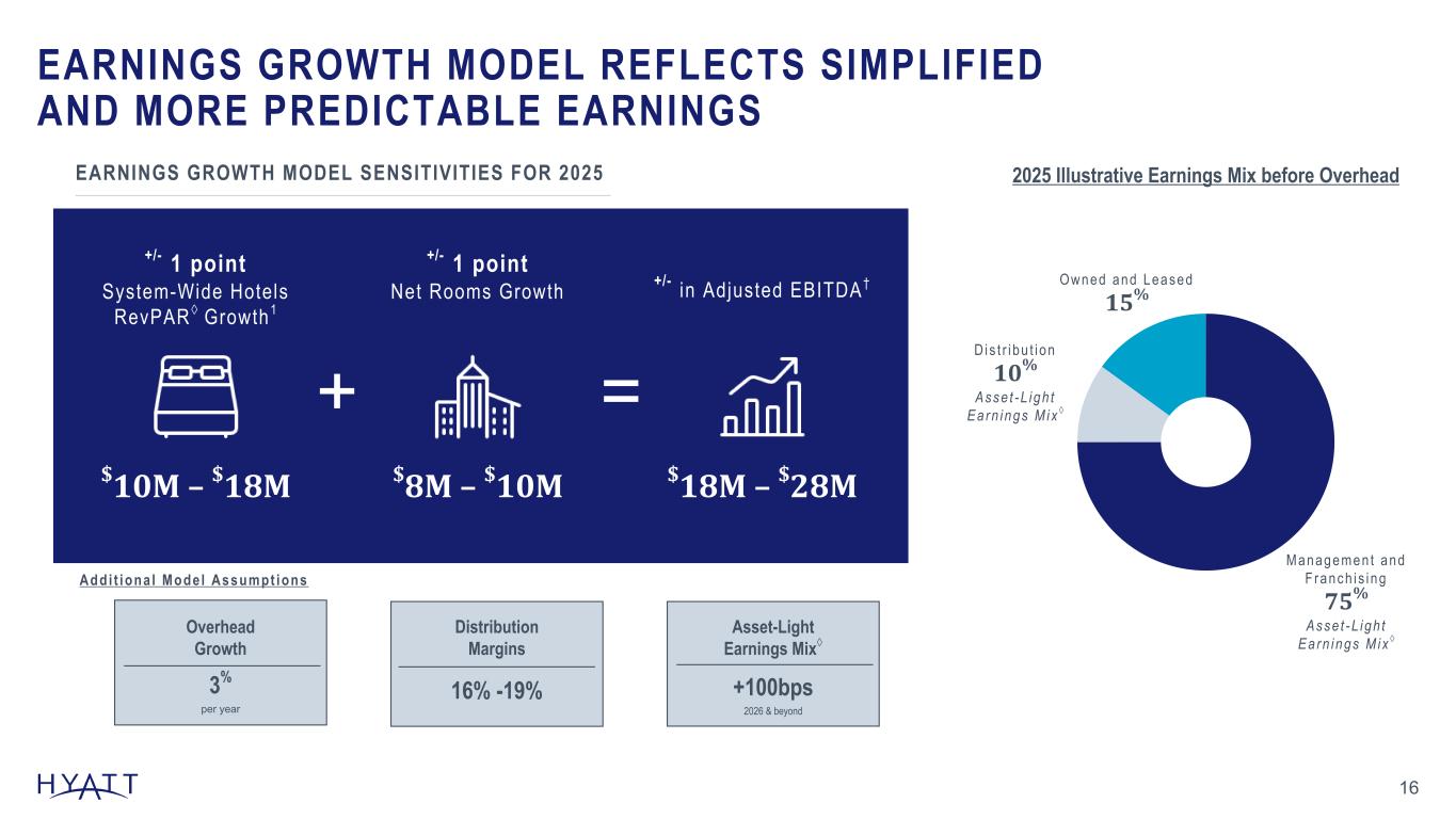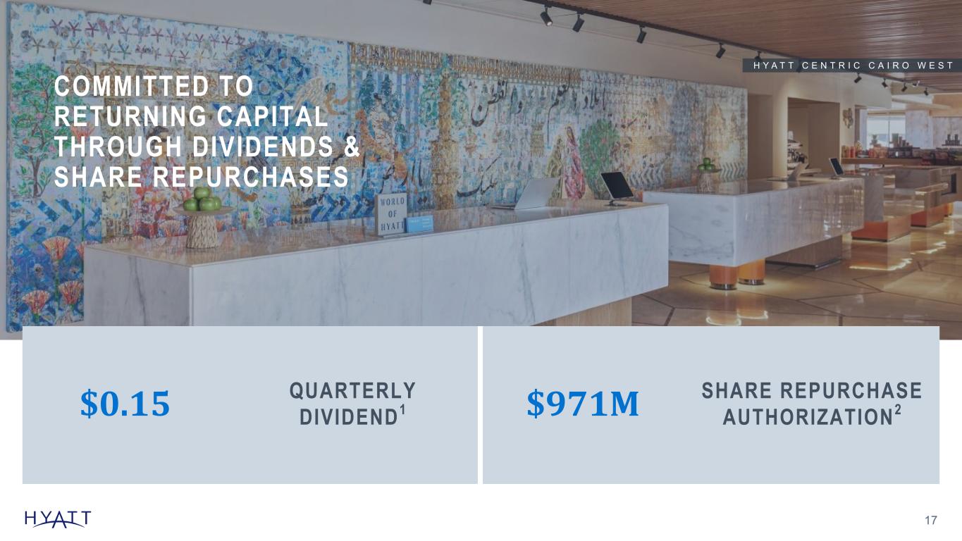 EARNINGS GROWTH MODEL REFLECTS SIMPLIFIED AND MORE PREDICTABLE EARNINGS 16 EARNINGS GROWTH MODEL SENSITIVITIES FOR 2025 +/- 1 point System-Wide Hotels RevPAR◊ Growth1 +/- in Adjusted EBITDA† $18M – $28M + = Addi t iona l Mode l Assumpt ions 2025 Illustrative Earnings Mix before Overhead Asset-Light Earnings Mix◊ +100bps 2026 & beyond Managemen t and F ranch i s i ng 75% Asse t -L igh t Ea rn ings M ix ◊ Dis t r i bu t i on 10% Asse t -L igh t Ea rn ings M ix ◊ Owned and Leased 15% +/- 1 point Net Rooms Growth $10M – $18M $8M – $10M Distribution Margins Overhead Growth 3% per year 16% -19% Source Notes: Footnotes: 1 System-wide hotels RevPAR◊ growth includes comparable hotels. The Company's illustrative long-term outlook for 2025 is based on a number of assumptions that are subject to change and many of which are outside the control of the Company. If actual results vary from these assumptions, the Company's expectations may change. There can be no assurance that the Company will achieve these results.