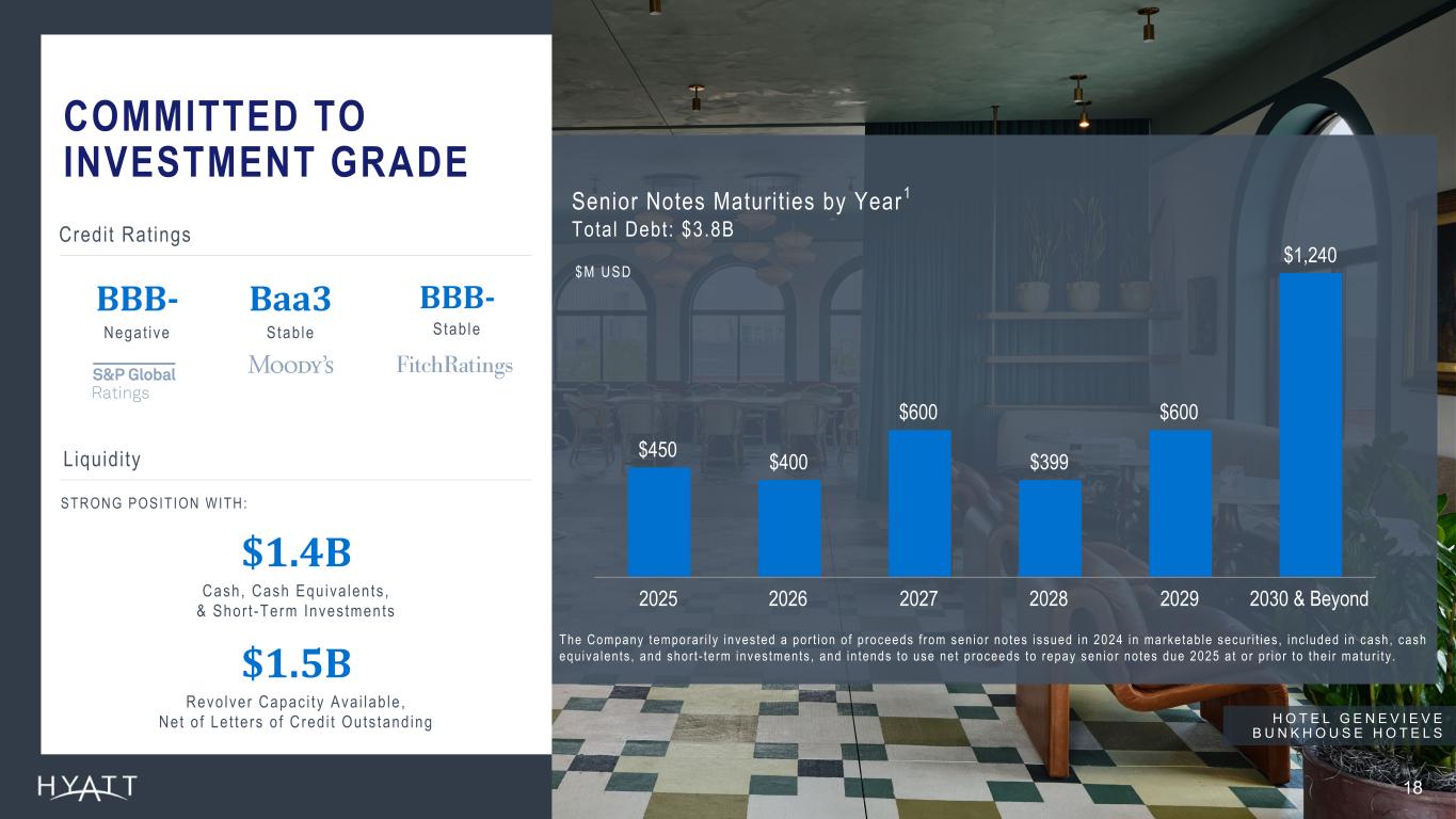 COMMITTED TO RETURNING CAPITAL THROUGH DIVIDENDS & SHARE REPURCHASES   17 H Y A T T C E N T R I C C A I R O W E S T Source Notes: Footnotes: 1 First quarter dividend payable on March 12, 2025 to shareholders of record as of February 28, 2025. 2 Share repurchase authorization as of December 31, 2024. Share repurchases may be made from time to time in the open market, in privately negotiated transactions, or otherwise, including pursuant to a Rule 10b5-1 plan or an accelerated share repurchase transaction, at prices that the Company deems appropriate and subject to market conditions, applicable law and other factors deemed relevant in the Company’s sole discretion. The common stock repurchase program applies to the Company’s Class A Common Stock and/or the Company’s Class B Common Stock. The common stock repurchase program does not obligate the Company to repurchase any dollar amount or number of shares of common stock and the program may be suspended or discontinued at any time. The Company’s 2025 outlook is based on a number of assumptions that are subject to change and many of which are outside the control of the Company. If actual results vary from these assumptions, the Company's expectations may change. There can be no assurance that the Company will achieve these results. No disposition or acquisition activity beyond what has been completed as of the date of this presentation has been included in the 2025 Outlook. $0.15 QUARTERLY DIVIDEND1 $971M SHARE REPURCHASE AUTHORIZATION2